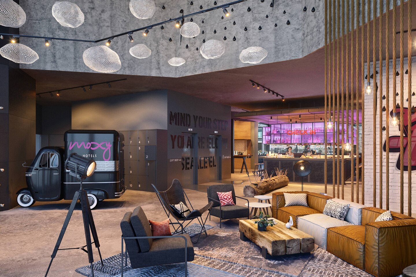De styling zit hem verder in de kleine details, die naar de Nederlandse identiteit refereren. Op de muur, vlakbij de liften, is af te lezen dat het hotel zich 4,5 meter onder het NAP-waterpeil bevindt. De interieurarchitect, die ook Moxy Houthavens ontwierp, heeft verder een aantal echte damwanden onderdeel van het restaurant gemaakt. Samen met de roze, hippe kleuren is er een stoer contrast.