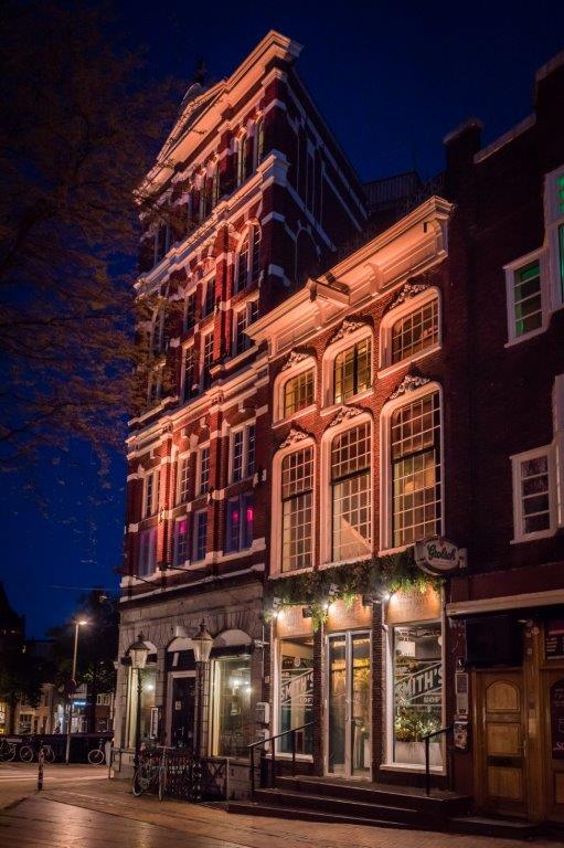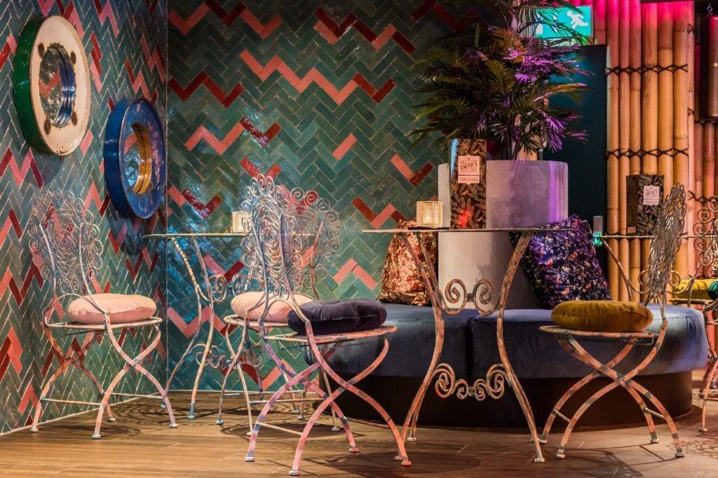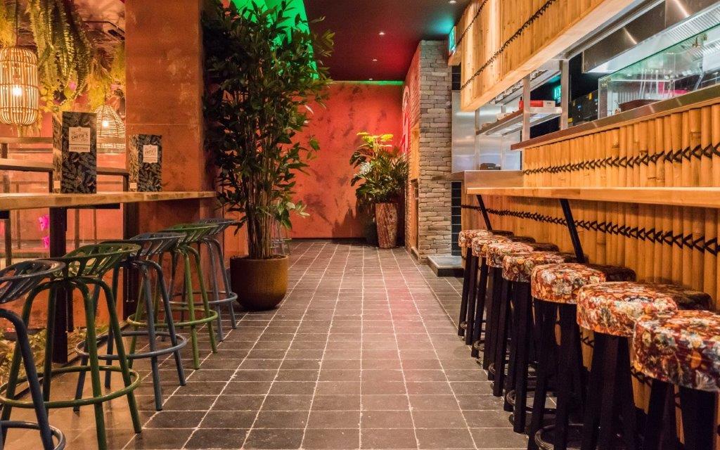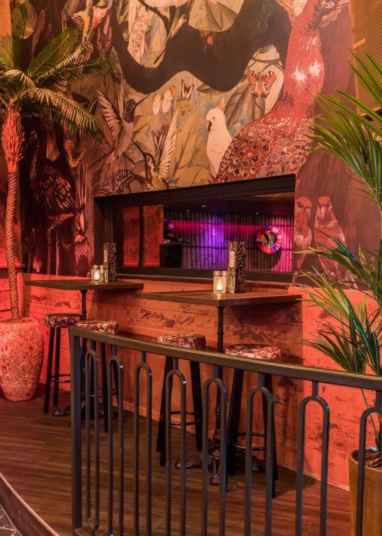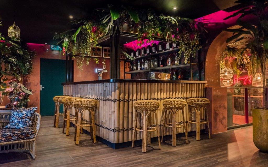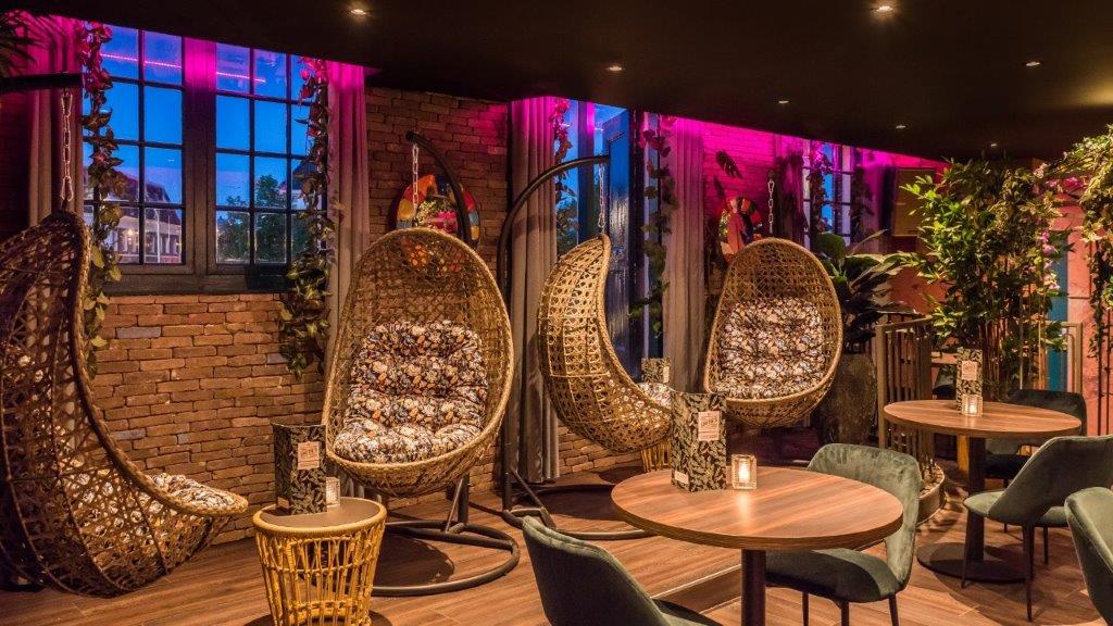 Jorg Wijnen van designbureau Art2Go: “Door het intieme interieur vol planten, vrolijke kleuren, drukke prints, schommelstoelen en zelfs een bed met uitzicht over de stad wanen gasten zich in een exotisch oord. Ook de relaxte loungezitjes, rotan meubels, bamboebekleding en gezellige hoekjes dragen daaraan bij. Eyecatcher van de eerste etage is de ronde bar met de grote metalen luifel met hanglampen.”