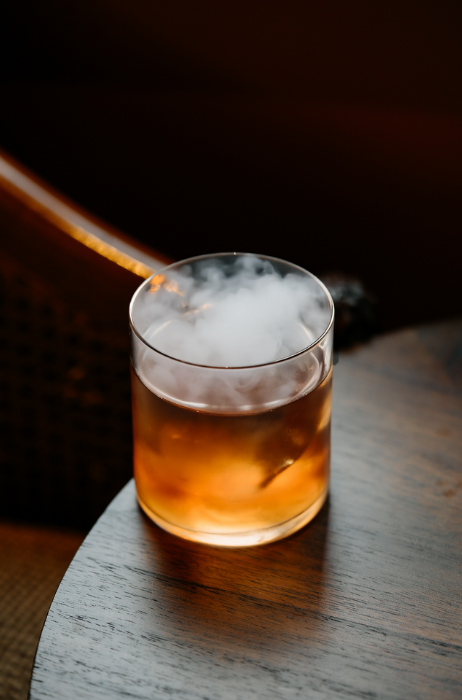 Stir de ingrediënten in een mixing glas met ijs, schenk uit en strain in een tumblerglas. Serveer in een stolp gevuld met houtrook.