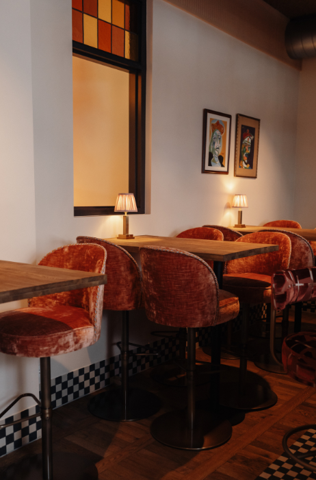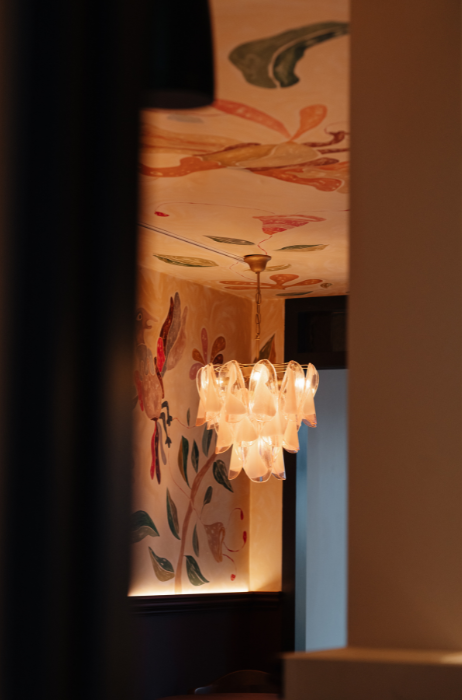 Opvallend in het interieur is de grote schildering op de wand en het plafond. Deze schildering, gemaakt door kunstenares Annemieke Denters, is ook zichtbaar bij de toiletruimte. Daarnaast hangen er speciaal ontworpen roze kroonluchters van handgeblazen Murano-glas.