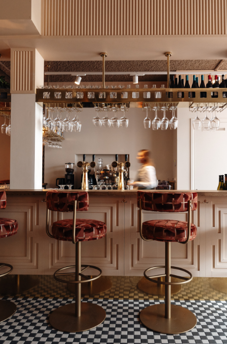 Het interieurontwerp, verzorgd door Even Eleven, maakt gebruik van warme kleuren, grafische patronen en een mix van materialen. Verschillende elementen, zoals glas-in-loodramen, brengen stedelijke kenmerken naar het Gooise dorp. De vloer is een combinatie van hout, zwart-witte mozaïektegels en terracottategels in een golvend patroon. Volgens ontwerper Michelle Jager is er bewust gekozen voor contrasten tussen strakke en ronde vormen om het geheel een speelse uitstraling te geven.
