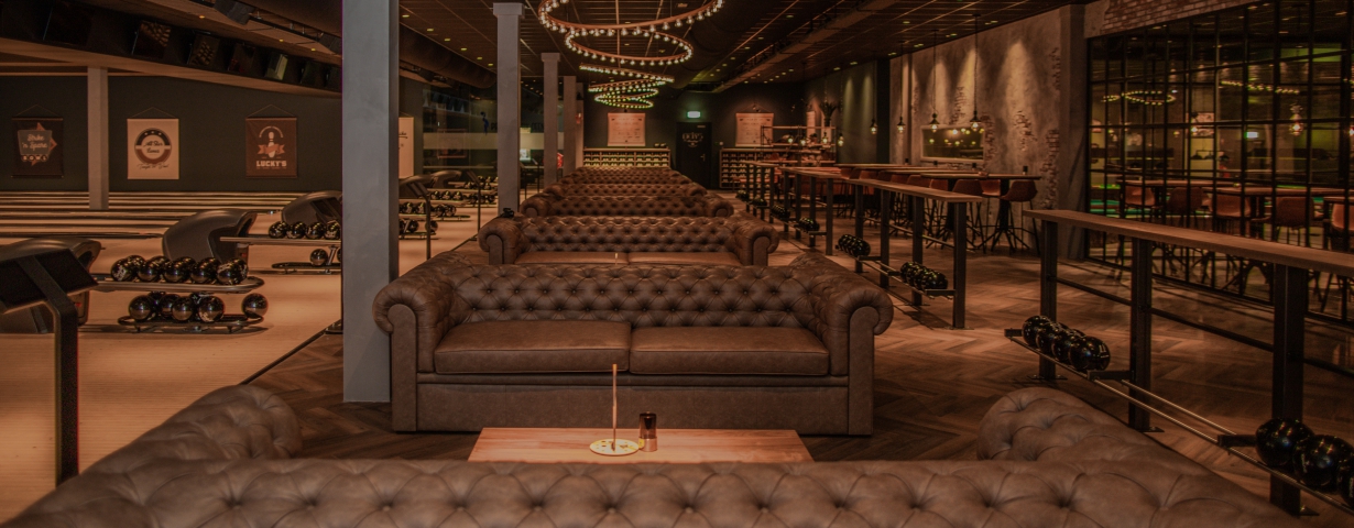 Waar de meeste bowlingbanen een ietwat gedateerde uitstraling hebben, vaart Lucky’s Bowling een geheel eigen koers. De combinatie van houten materialen, metaal, velours en industriële lampen zorgen voor een huiselijke sfeer. 3D-ontwerper Alexander de Bruin heeft de locatie ingericht met klassieke Chesterfields en meubilair van onder meer Dutchbone en Zuiver, twee in de designwereld hoog aangeschreven Nederlandse interieurmerken. Lucky’s is de uitgaansgelegenheid waarvan je hoopt dat ze nog een baan vrij hebben op de vrijdagavond of zondagmiddag. Van een borrel met vrienden, tot een amuserend uitje met de kinderen, zeven dagen per week. Bowlen hoeft niet in alle drukte en met toeters en bellen. De bowlingmachines hebben namelijk een speciale geluidsabsoberende laag waardoor het geluid in de zaal sterk wordt gedempt. Daarnaast kunnen gasten gedeeltelijk achter glas genieten van de gerechten uit de keuken, met uitzicht op de bowlingbanen. Een uur bowlen kan gecombineerd worden met een bezoek aan een van de escaperooms en het Italiaanse restaurant ‘Sweet Lake Italy’. De zakelijke markt kan zelfs neerstrijken in een van de vergader – of evenementzalen van het complex.