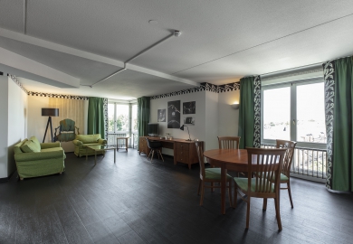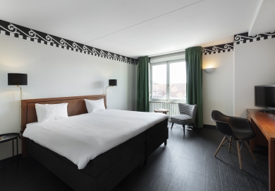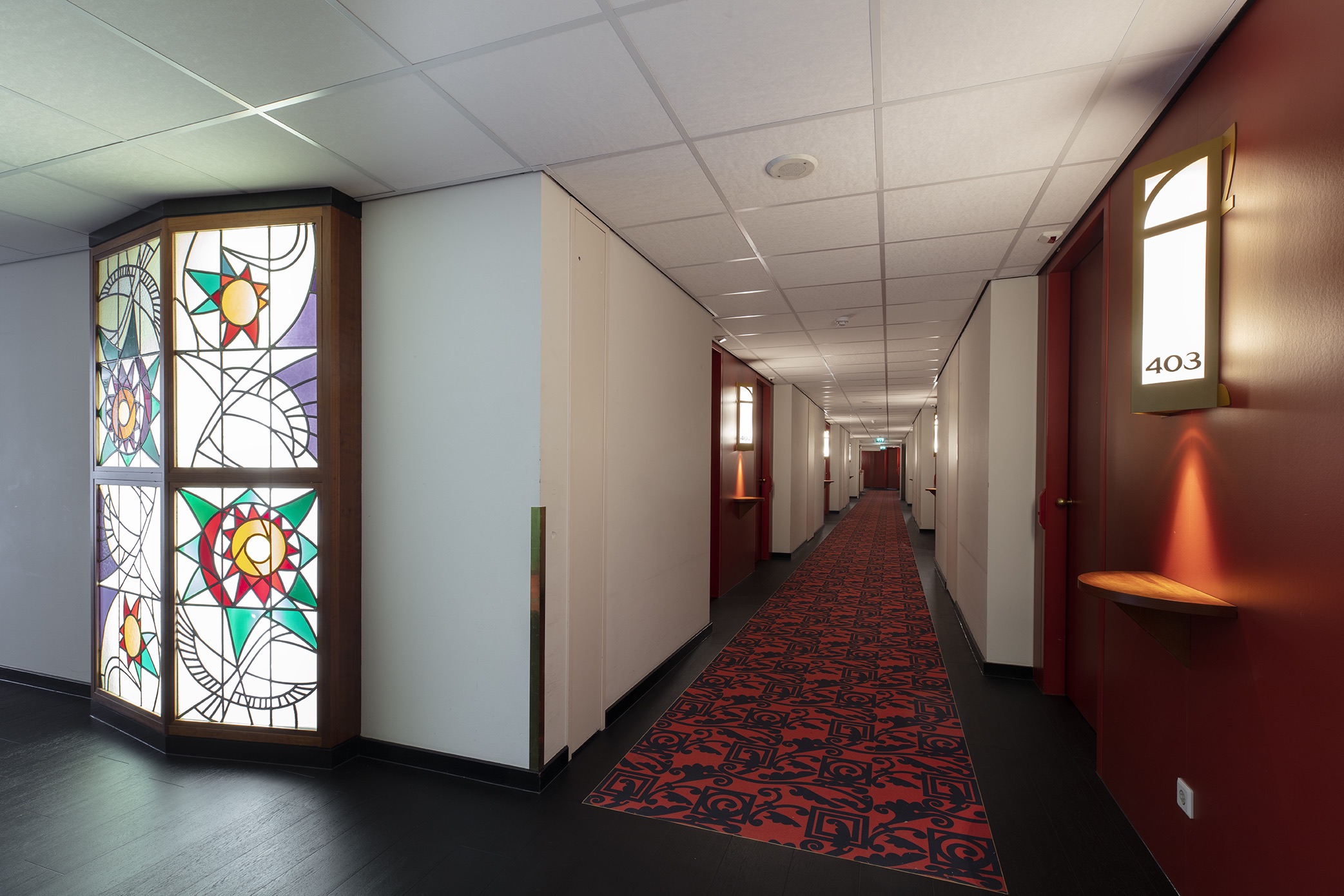 De pijlers voor het nieuwe interieur waren het familiebedrijf met al zijn historie en traditie, de bossen van de Heuvelrug en het feit dat Figi een een hotel met een theater is. Zwart-wit vormt de basis van de nieuwe stijl van Figi, maar ook groen, hout en 'Ravage-elementen' komen terug in het interieur. De Parijse krullen van het voor kenners wereldberoemde Ravage-duo zie je terug in de Flotex Vision vloer van Forbo Flooring in de gangen van het hotel. Om de hotelkamers een gezellige, maar toch strakke uitstraling te geven is gekozen voor Allura zwart eiken. Deze vloer combineert het warme gevoel van hout met de unieke eigenschappen van PVC, dat bijvoorbeeld nauwelijks onderhoud vraagt en heel makkelijk is schoon te maken.
