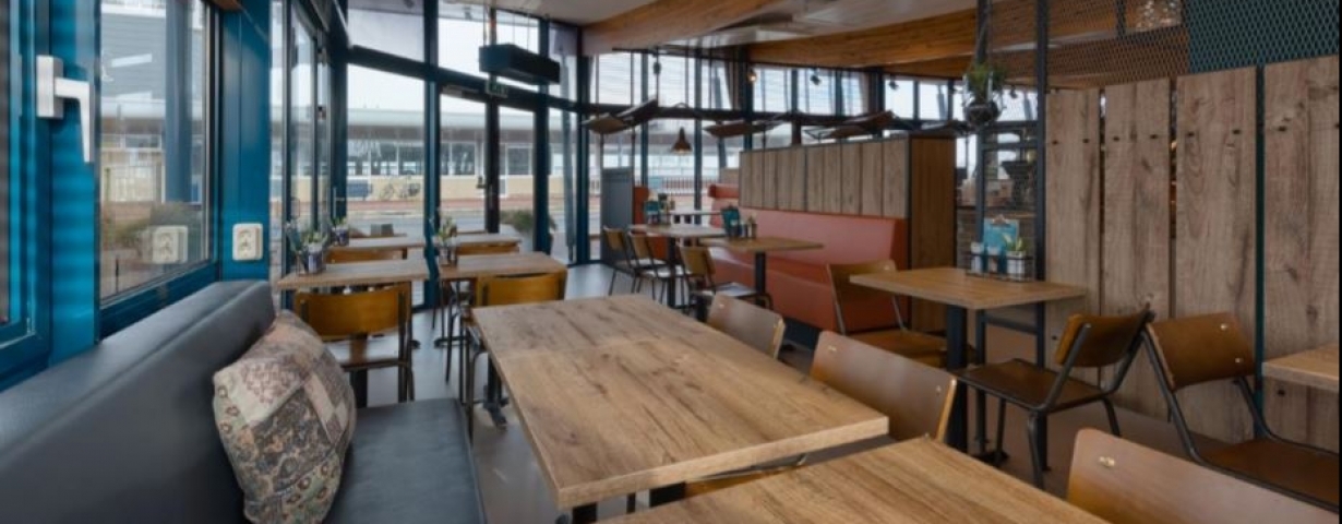 Voor al die gasten wilde eigenaar Alex Terpstra een restaurant dat elk type reiziger zou aanspreken. Wad Lekkers moest een moderne inrichting krijgen. “Ik wilde een industriële sfeer met veel staal en een betonlook. Ook moest het geschikt zijn voor wie snel wat komt eten en we wilden iets met al die koffers die steeds op de vloer stonden en waar iedereen over struikelde.” Met onder meer een marmoleumvloer in betonlook, veel stalen details om een natuurlijke afscheiding en handige routing in het restaurant aan te brengen en de materiaalkeuze en vormgeving voor het meubilair werd de gewenste sfeer gecreëerd.
