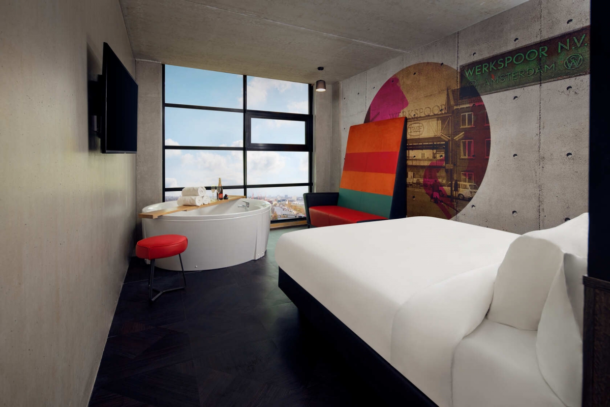 Na het ervaren van de veelzijdigheid van de stad, kun je op het terras van Bar & Brasserie Werkspoor aan de kade genieten van een idyllisch uitzicht over water. Misschien sluit je de dag wel af met een duik in het zwembad of in je privé bubbelbad. De stad ontdekken én van een hotelovernachting een verwenmoment voor jezelf maken. Dit is onze visie bij hoe je Amsterdam wil ervaren” vertelt Karin. Het restaurant is voorzien van metershoge ramen en een glazen dak. Het is industrieel, licht en ruimtelijk. De stalen zwarte constructie geeft het restaurant karakter. Op zonnige dagen is het aan water gelegen buitenterras geopend.