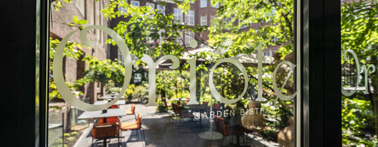 De naam van de gardenbistro is geïnspireerd op de gelijknamige zangvogel Oriole, wiens naam is afgeleid van het Latijnse 'aureolus', dat 'gouden' betekent. De zangvogel komt dan ook op allerlei speelse manieren terug in de look and feel van de gardenbistro. De vogel staat symbool voor het motto van de gardenbistro "feel free". Chef de Cuisine, Raoul Meuwese, heeft samen met zijn team het menu samengesteld. In Oriole worden gerechten geserveerd met krachtige, eerlijke smaken. "Het menu, de wijnkaart en het interieur zijn geïnspireerd op de groene, weelderige Mediterrane kust. De ingrediënten die wij gebruiken in onze gerechten zijn seizoensgebonden, herkenbaar en zijn deels verkregen uit onze eigen daktuin. Het is voor mij iedere dag weer een genot om met deze verse ingrediënten en kruiden te werken want ze zorgen voor een echte smaakexplosie, juist door hun eenvoud.'', aldus Meuwese.