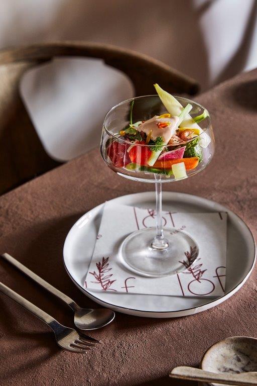 Voor de menukaart van LOF ontwikkelde Eleveld simpele, herkenbare gerechten. Van een garnalencocktail of tong à la meunière tot kalfszwezerik, vegetarische gerechten of een Tomahawk van 70 euro voor twee personen. “Maar je kunt hier ook binnenkomen voor een kop goede koffie met mijn eigen interpretatie van appeltaart of mijn versie van klassieke eclairs”, zegt hij. De hele dag door kun je bij LOF terecht. Op de snackkaart onder andere charcuterie en bitterballen van ossenstaart, maar er is ook een lunchkaart en een dinerkaart in alle prijsklassen, waaronder een menu Bib Gourmand voor 39,00 euro. Eleveld : “Ik wil een huiskamer creëren waar iedereen kan aanschuiven. En dat als je er eenmaal bent, nooit meer weg wilt. Denk aan het joie de vivre van een Parijse bistro in combinatie met de sereniteit uit Scandinavië.”