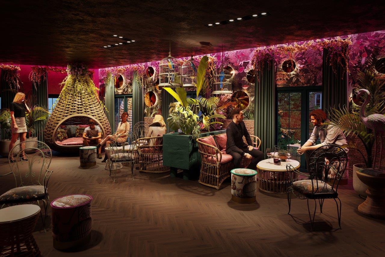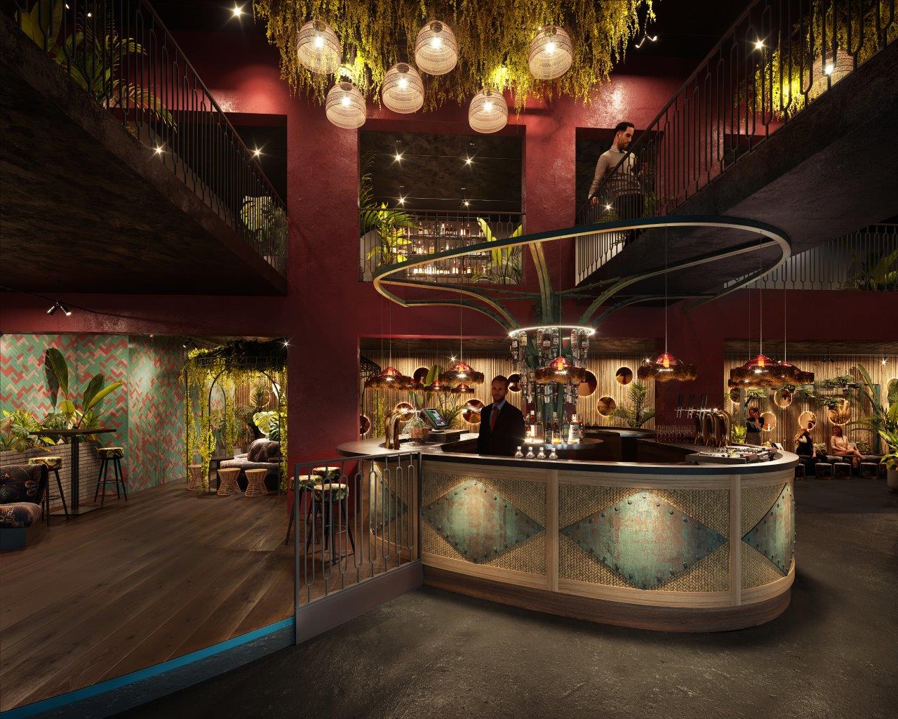 Wijnen: “Door het intieme interieur vol planten, zachte pastelkleuren, schommelstoelen en zelfs een bed met geweldig uitzicht over de stad wanen gasten zich in een exotisch oord. Ook de relaxte loungezitjes en gezellige hoekjes dragen daaraan bij. Eyecatcher van de eerste etage is de ronde bar in het midden met een grote metalen luifel met hanglampen Bijzonder: gasten kunnen eten aan de open keuken op de tweede etage. Vanaf hier heb je dankzij de vides een mooi overzicht op de eerste verdieping.”