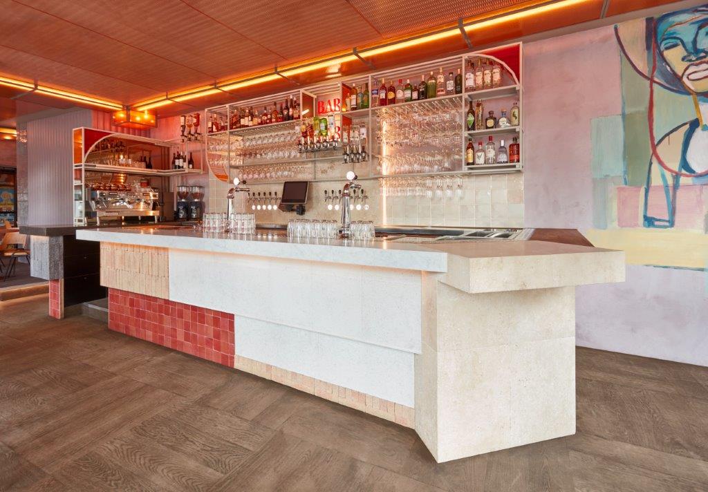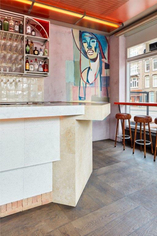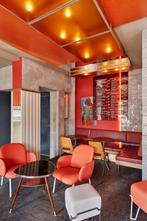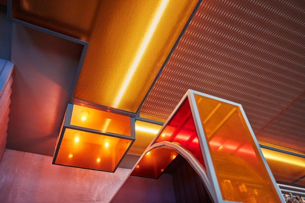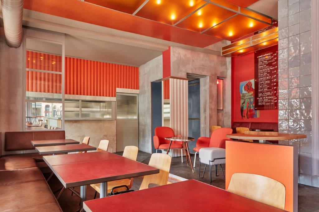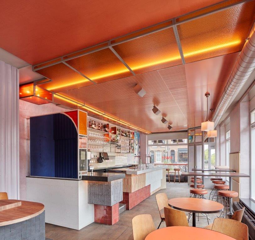 Alle biertaps en andere functies worden onder de wandkast geplaatst, waardoor de voorste bar is vrijgemaakt als een perfecte plek om te zitten en een drankje te drinken. Het plafond wordt grafisch verdeeld, waarbij de structuur van het gebouw als richtlijnen wordt gebruikt, in een raster van akoestische panelen, omlijst door lineaire lichtbakken. De lichtbakken zenden een diffuus warm licht uit dat schijnt door ouderwets geel fiberglas en zorgt voor een uitnodigende en gezellige sfeer. Contrasterende texturen zijn op elkaar gestapeld, zoals het muurmenu dat op oranje glas is geschreven en tegen gele linoleumpanelen is geplaatst. Van de unieke door Studio Modijefsky ontworpen grafische vormgeving tot de opvallende Jasper Krabbé-schilderij aan de muur, je kunt zien dat Ramona een uitgesproken, gedurfde bar is met een unieke uitstraling die je hart steelt.