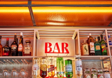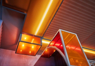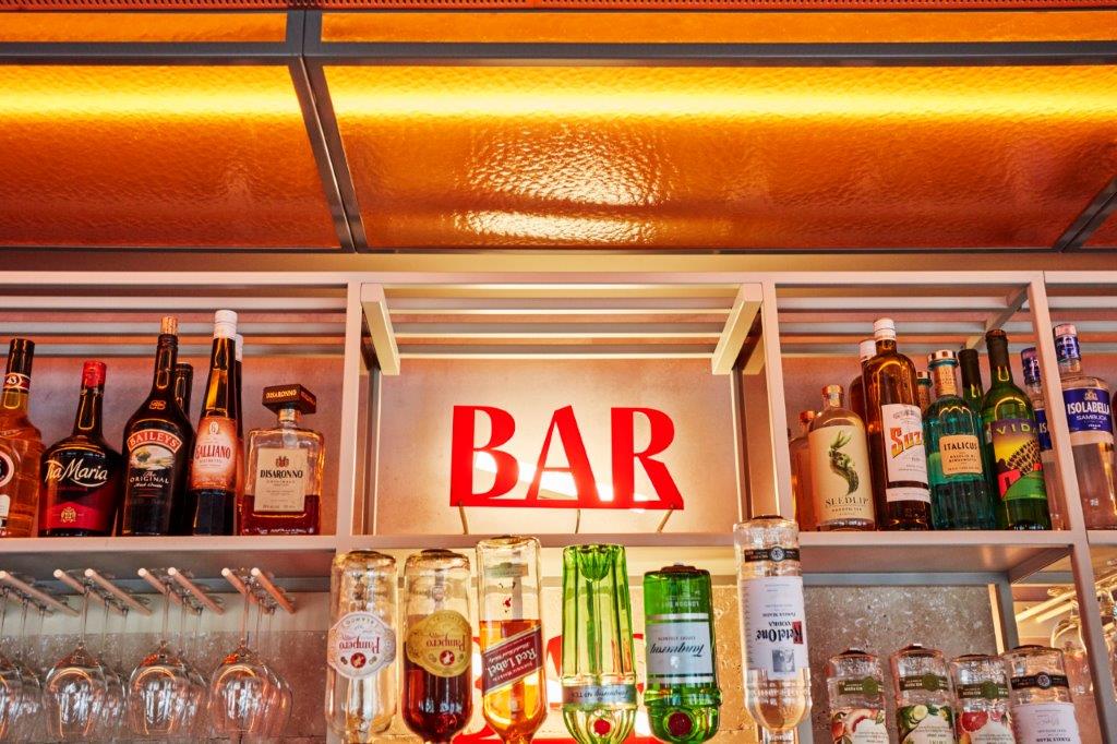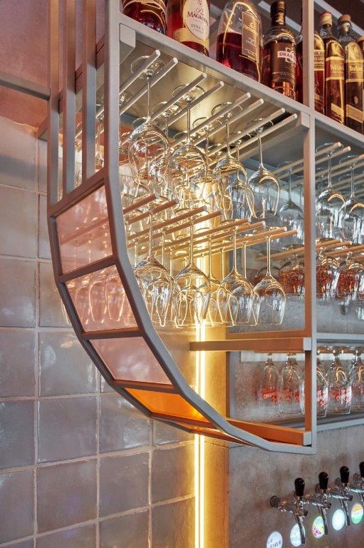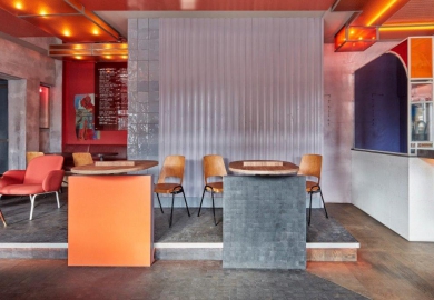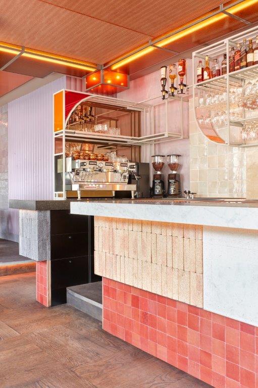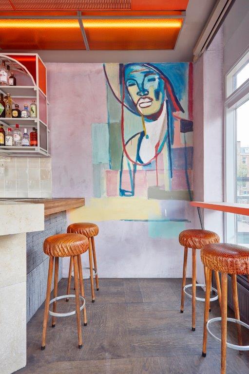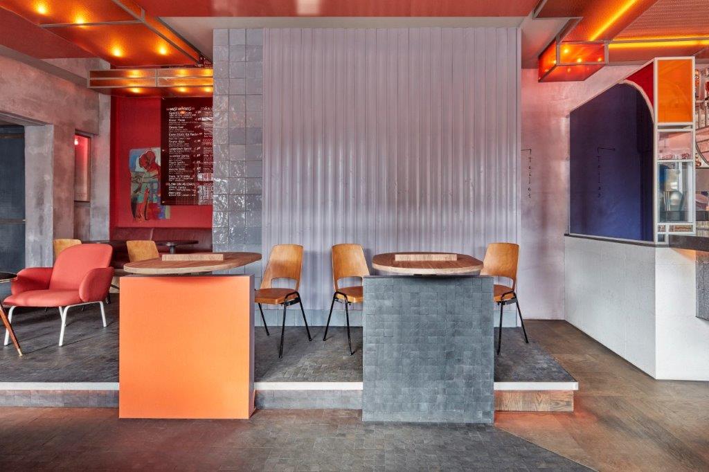 Alle biertaps en andere functies worden onder de wandkast geplaatst, waardoor de voorste bar is vrijgemaakt als een perfecte plek om te zitten en een drankje te drinken. Het plafond wordt grafisch verdeeld, waarbij de structuur van het gebouw als richtlijnen wordt gebruikt, in een raster van akoestische panelen, omlijst door lineaire lichtbakken. De lichtbakken zenden een diffuus warm licht uit dat schijnt door ouderwets geel fiberglas en zorgt voor een uitnodigende en gezellige sfeer. Contrasterende texturen zijn op elkaar gestapeld, zoals het muurmenu dat op oranje glas is geschreven en tegen gele linoleumpanelen is geplaatst. Van de unieke door Studio Modijefsky ontworpen grafische vormgeving tot de opvallende Jasper Krabbé-schilderij aan de muur, je kunt zien dat Ramona een uitgesproken, gedurfde bar is met een unieke uitstraling die je hart steelt.