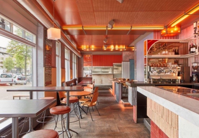 Stel je voor, een jonge rebelse dochter van een traditionele Belgische café-eigenaar, daar past de naam Ramona perfect bij. Het interieur refereert aan de traditie van klassieke bars met veel donker hout, glas in lood, beschermende lambrisering en spiegelafwerkingen; allemaal opnieuw uitgevonden met een veel jongere houding. Deze ongewone combinatie resulteert in een bohemien ruimte, waar gedurfde details en onverwacht gelaagde materialen op zichzelf een excentrieke sfeer creëren.
