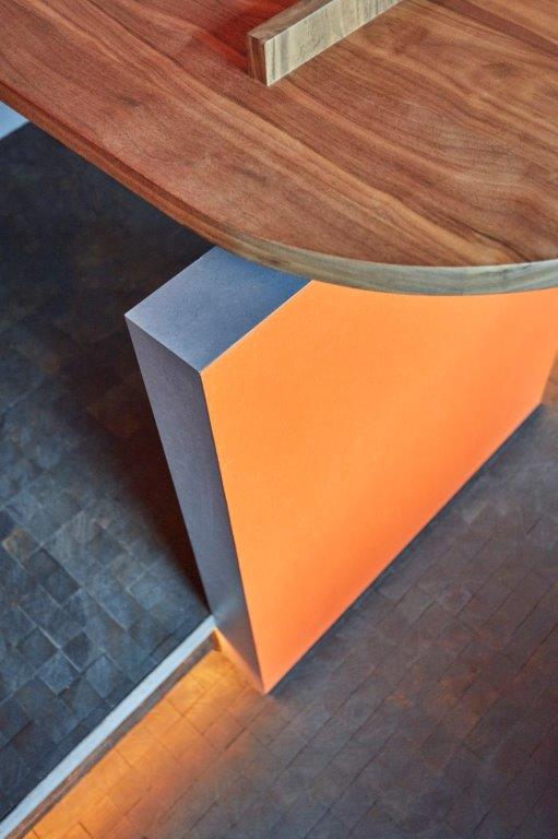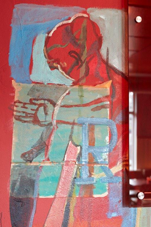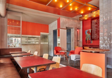 Ramona's interieur is verdeeld in vier verschillende gebieden. De bar, gelegen direct bij de ingang, geeft de ruimte een gastvrije sfeer. Dan een lichte eethoek, met tafels geplaatst onder grote ramen met uitzicht op de gracht. Een aparte lounge, met verhoogde zwart marmeren tegelvloeren, breekt de ruimte. De keuken, met bovenste deel bekleed met fel oranje lambrisering, is helemaal achterin. Kenmerken van de bestaande architectuur zijn omarmd en geven een eigenzinnig randje aan het nieuwe ontwerp. Het geometrische patroon in de originele glas-in-loodramen is gebruikt als inspiratie voor de vorm van de bar, opgebouwd uit beige travertineblok, witte terrazzotegels en verschillende gekleurde stenen. Een ander fragment van dezelfde vorm wordt vervolgens opnieuw herhaald en verandert dit keer in een op maat gemaakte stalen en gekleurde glazen wandkast die boven de bar hangt.