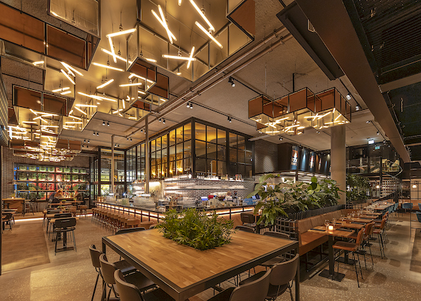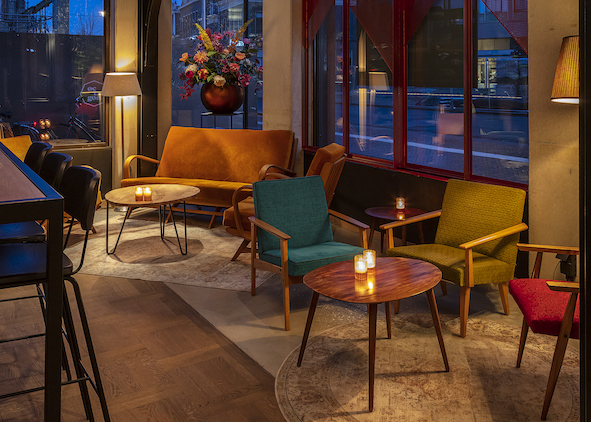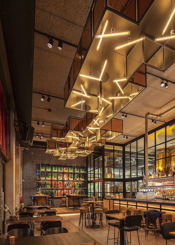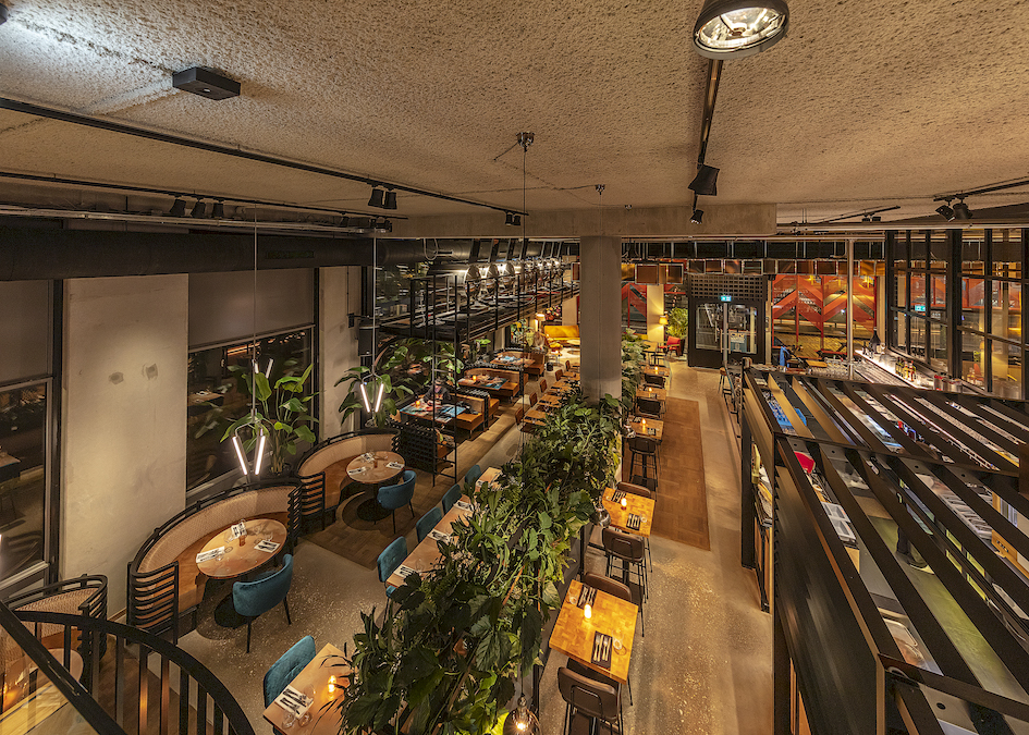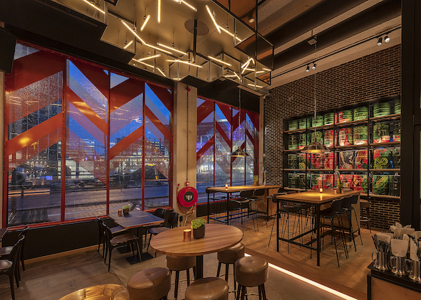 Ferry Tabeling en Peter Roozeboom van Heineken Interieur Design over het interieur: “De zaak kenmerkt zich door een grote bar, industriële details en een kleurrijk en eigentijds jasje. Van de entree waar je binnenwandelt voor een biertje aan de bar tot aan het restaurantgedeelte met luxere stoffen en een warmere uitstraling verder achterin.”