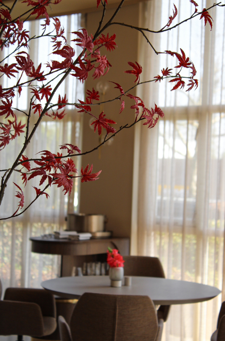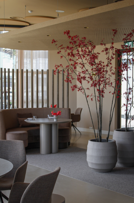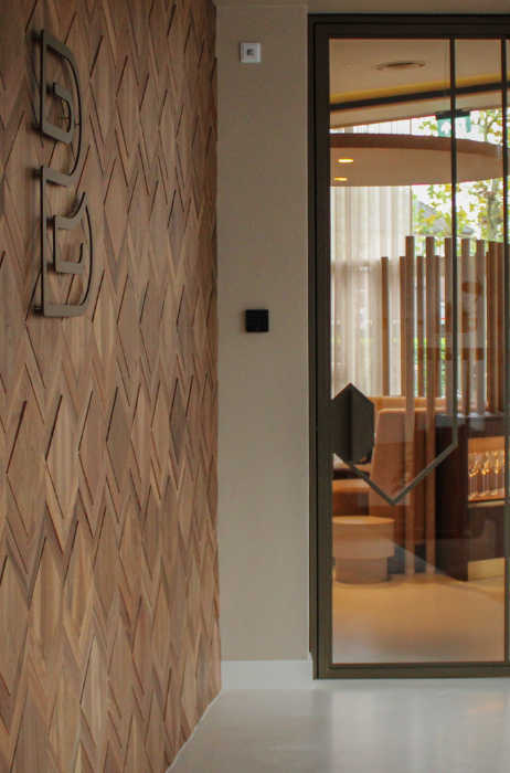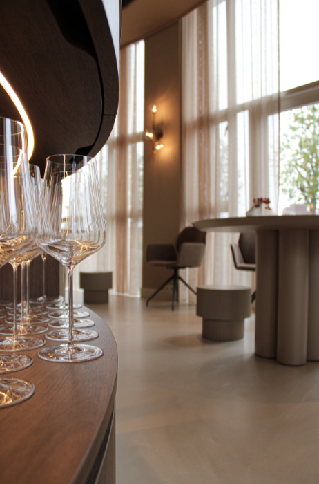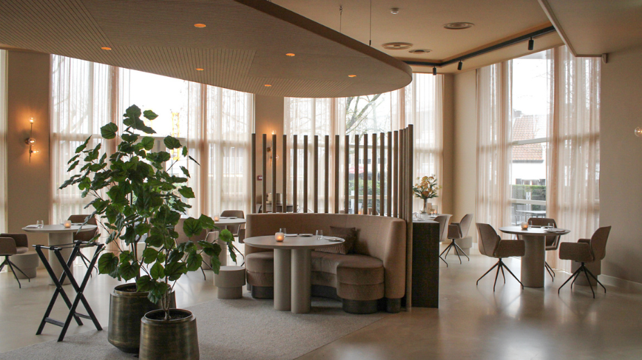 De entree van het restaurant is vernieuwd en leidt via een wand van walnotenhout naar de eetruimte, waar natuurlijke tinten, zachte stoffering en moderne elementen het interieur kenmerken. Het ontwerp is gerealiseerd in samenwerking met interieurarchitect PuurBasic, gevestigd in Sint-Oedenrode.