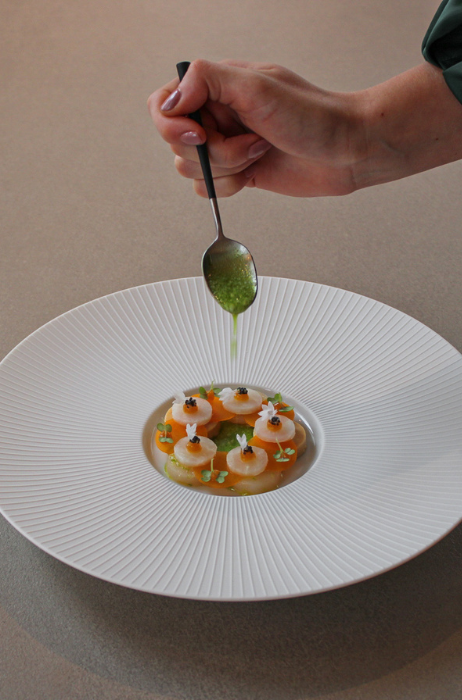 Een opvallend element in het restaurant is de halfopen keuken, die door middel van getint rookglas gedeeltelijk zichtbaar is voor gasten. Deze opzet biedt zicht op de keukenwerkzaamheden zonder afbreuk te doen aan de rust van de ruimte.