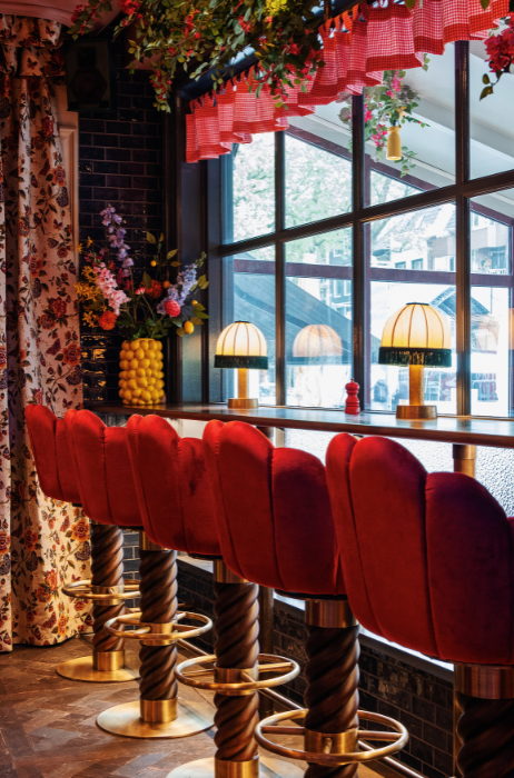Als je een blik omhoog werpt zie je een suède plafond met veel groen en bloemen en hangen er velours gordijnen.