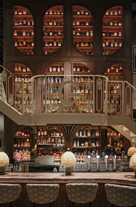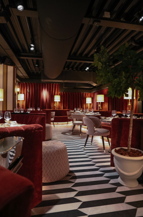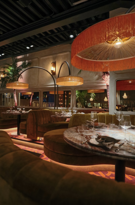 Hell staat bekend om zijn gedurfde concepten en prikkelende interieurs. Zo won hij met het Zalmhuis in Rotterdam de Entree Award voor ‘Best New Bar and Restaurant 2021’. Deze uitgesproken identiteit kenmerkt ook het interieur van Grace. Wereldse elementen komen samen in de stijlvolle patronen van de vloeren. Kleuren zijn warm en gedurfd bij elkaar gezocht en de oplettende kijker kan hier veel jaren 20-elementen ontdekken.