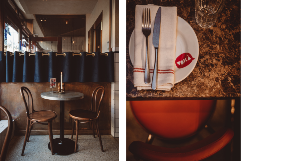 Het interieurdesign is van de hand van Casper Reinders in samenwerking met Maureen Woudstra van interieur designbureau Studio Matiik en OST interior. En ook hier – verwijzend naar Le French Café in de Javastraat – zijn de witte tegels en oude spiegels prominent aanwezig, net als de kenmerkende bar waar. Maar de gehele vibe is wat rauwer, meer uitgesproken; een beetje meer New York meets zwoel Parijs. Denk aan een tin tile plafond, industriële verlichting en een samensmelting van vintage meubels en moderne materialen. Maar ook aan een ‘fruits de mer’ bar gedecoreerd met allerhande moois uit de zee.