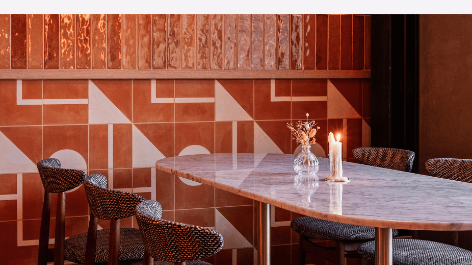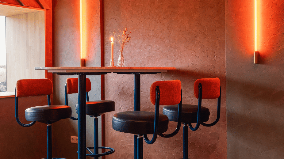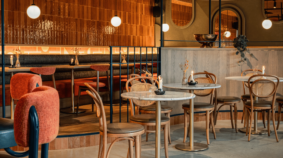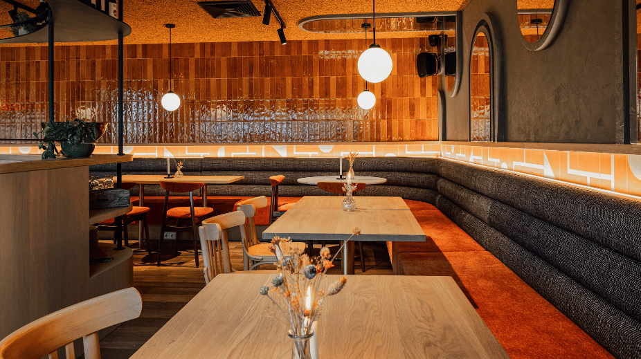 Horeca Sfeermakers is verantwoordelijk voor het design. De zaak is gevuld met warme kleuren, ronde vormen, mozaïektegeltjes en neonlampen. De centrale bar is een ware eyecatcher.