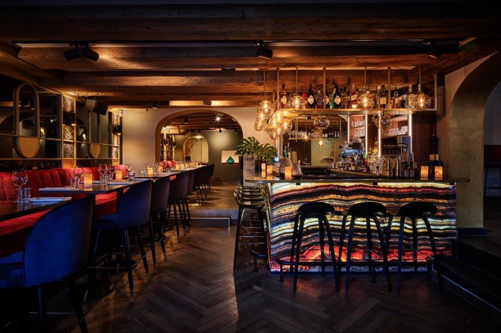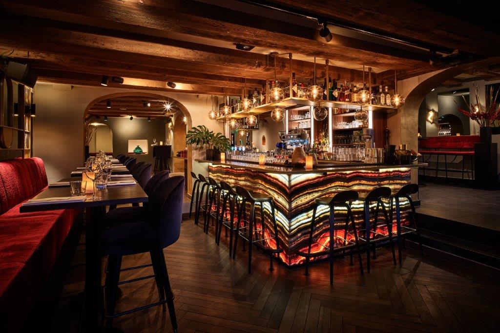 Beneden is er een casual gedeelte met een huiskamersfeer. Eyecatcher zijn er de bar van onyx, een steensoort. Karakteristiek zijn verder de kroonluchters, de houten balken, die de lage plafonds dragen, en het fluweel beklede meubilair.