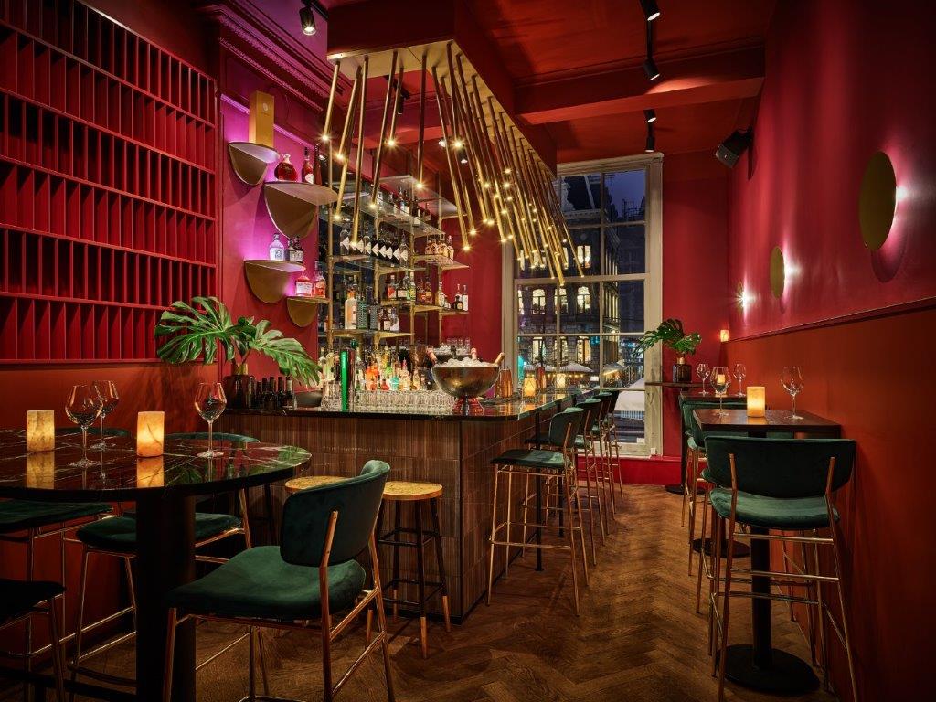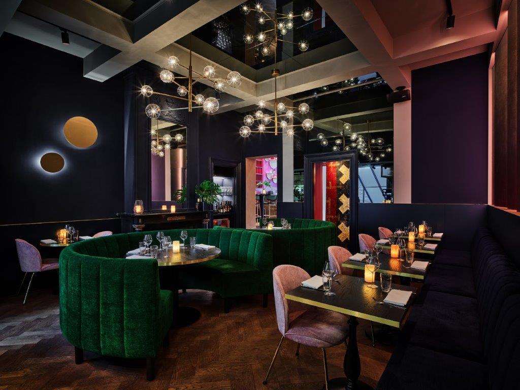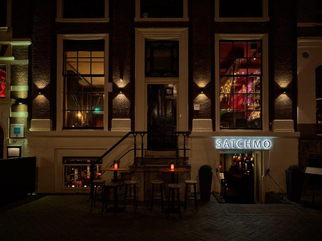 De bovenste etage heeft juist een kosmopolitische sfeer en andere opvallende elementen, zoals ronde, groene banken en een vuurrode muur. Gasten kijken er bovendien uit op de open keuken. Het interieur van Satchmo is al met al rijk, comfortabel en chic te noemen.