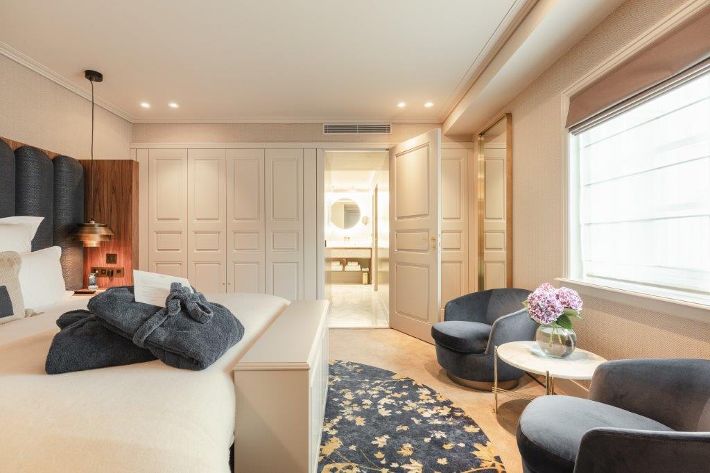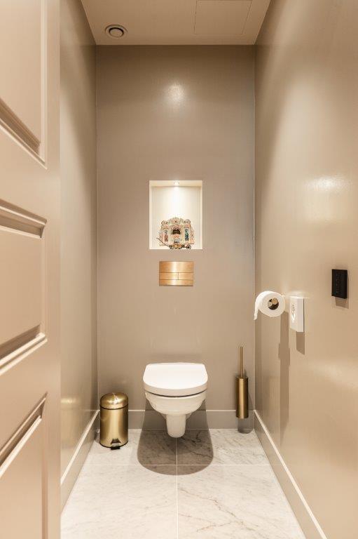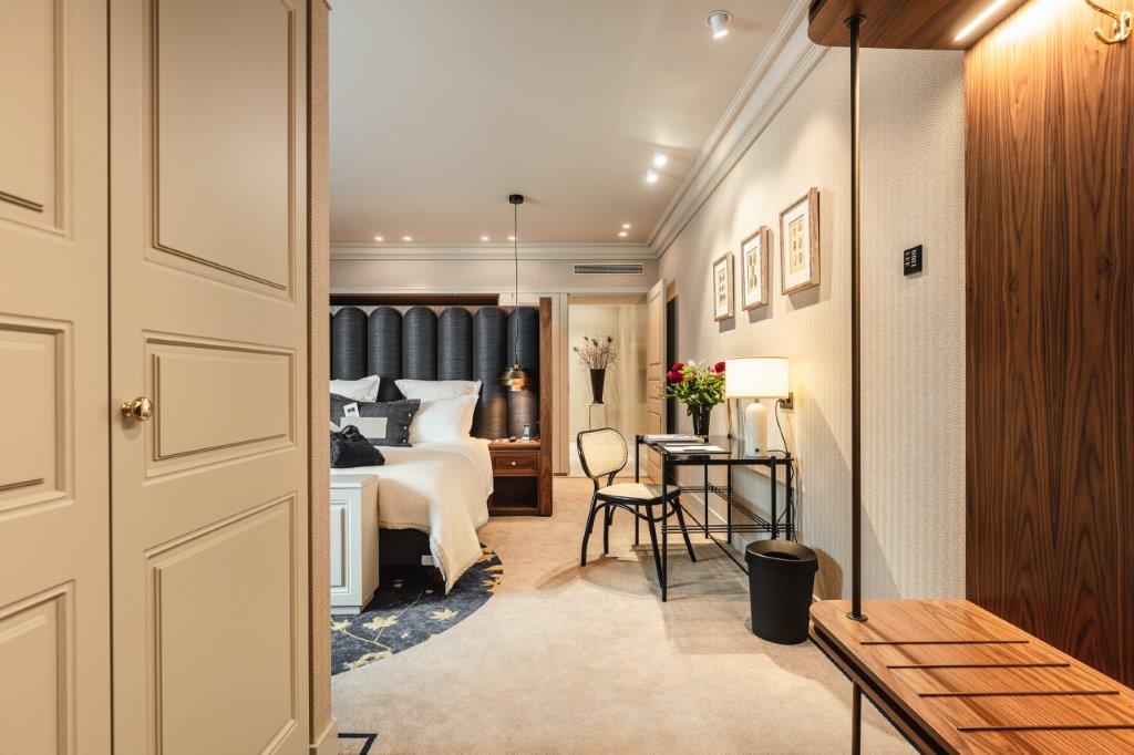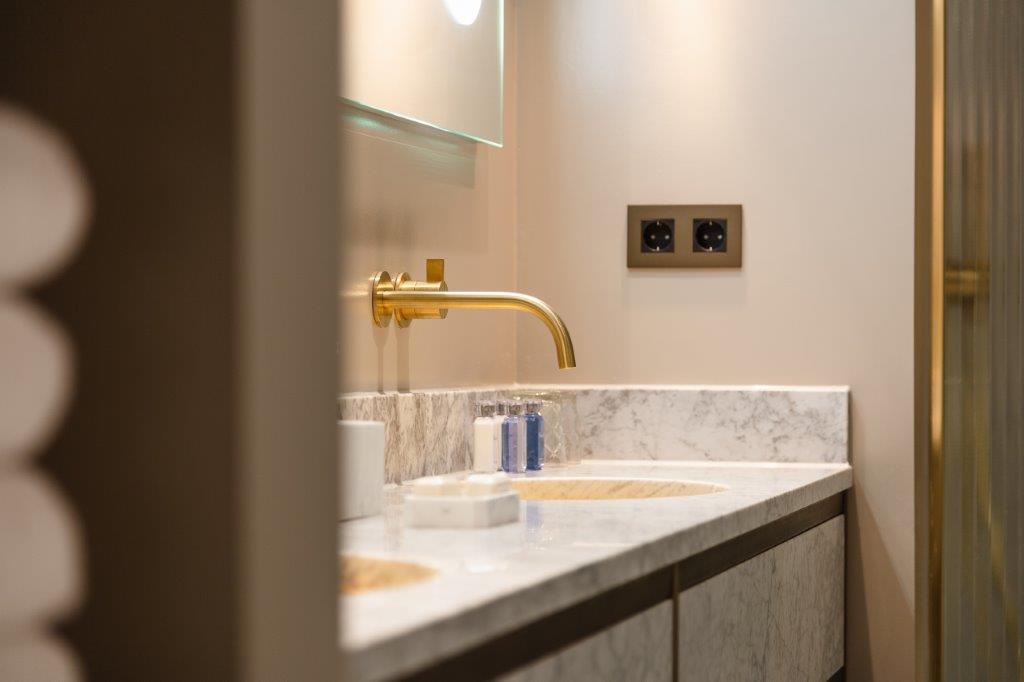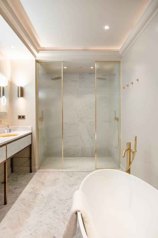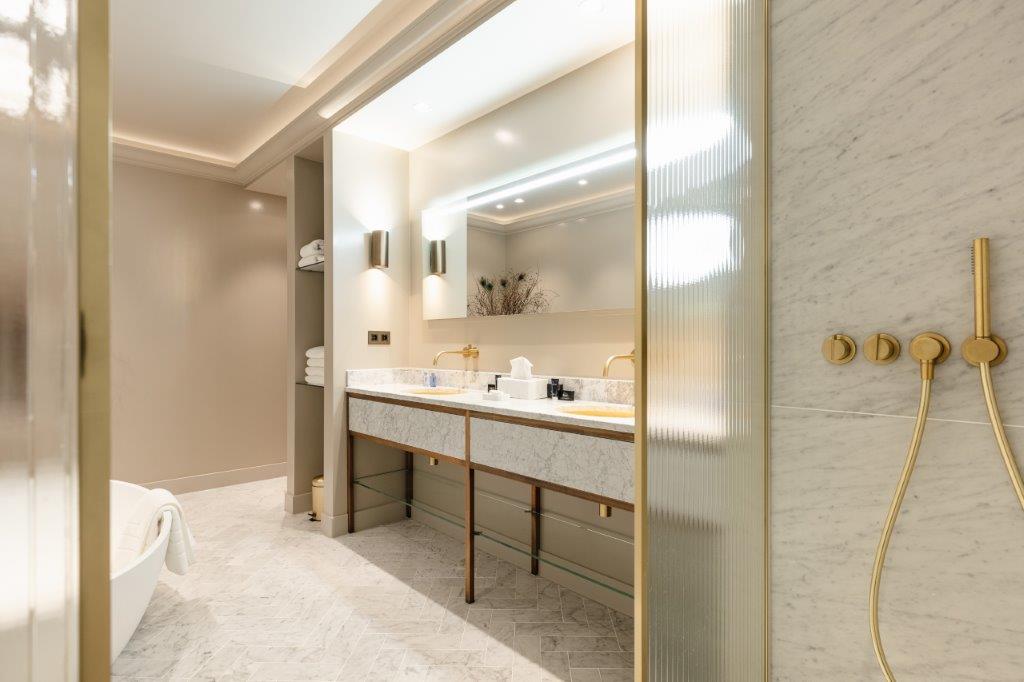 In de badkamer zetten de taupe tinten zich door in combinatie met wit marmer en gouden kranen en details. Met de riante inloopdouche en lichtbad zijn er volop mogelijkheden om te ontspannen. Het geribbelde glas geeft een klassiek gevoel wat goed past bij de spirit van het hotel. De kamers bieden gasten al met al een verblijf in ultieme luxe. Een 'home away from home' waar elke wereldreiziger zich thuis voelt."