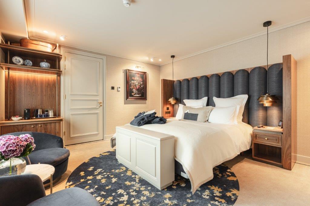 Over de kamers zeggen ze: "Bij binnenkomst in de kamer vallen de zachte taupe tinten op, afgewisseld met notenhout, diep blauw en gouden details die een zeer warme en uitnodigende sfeer creëren. De fluweel blauwe chaise longue is de perfecte plek voor een drankje en een boek. Even opladen voor het diner. De kinderen kunnen zich eventueel terugtrekken in hun eigen bedstee."