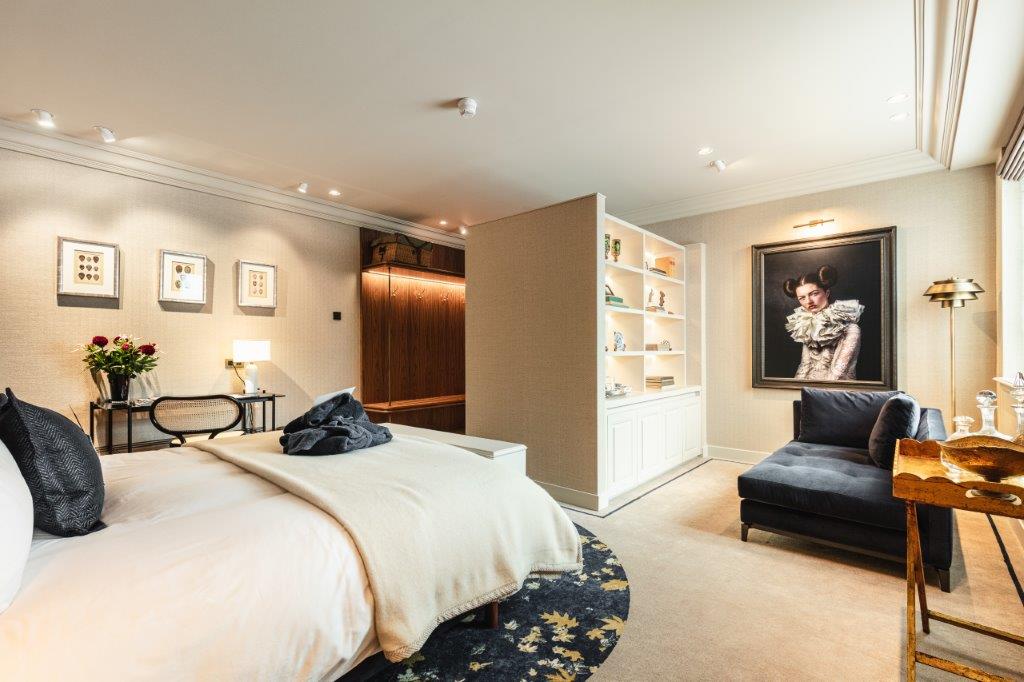Neem bijvoorbeeld de gang: "De prachtige werken, volledig samengesteld door Public House of Art, zijn een mooie verwijzing naar de vorige eigenaren van het pand. Zij hebben door de jaren heen een indrukwekkende kunstcollectie verzameld. Het handgeweven behang glinstert subtiel door het strijklicht van de bronzen wandlampjes. De gang voelt meer als een kunstgallerij."