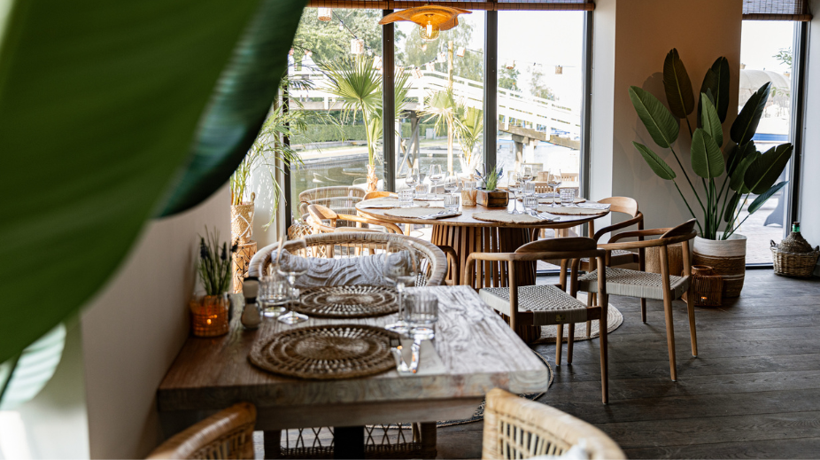 Hoogenboom noemt zijn zaak een bohemian grandcafé, een bewuste keuze. “Een restaurant voelde te klassiek, een eetcafé deed het eten tekort. Het concept is stijlvol, maar ontspannen en doet qua sfeer denken aan de beachclubs die je aan de westkust vindt. Wij zitten natuurlijk niet aan zee, maar wél aan het water. Daarom wilde ik zo’n zelfde soort setting hier creëren.”