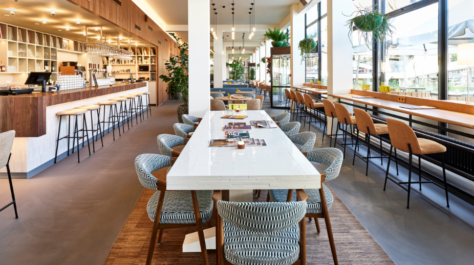 Op de begane grond is Stadscafé Boove & Benee, een plek waar 120 gasten kunnen lunchen, borrelen of dineren. Een gelakte stamtafel van Piet Hein Eek, omringd door vintage jarenzestigstoelen, trekt hier de aandacht. Een andere eyecatcher is de muziekbar met vinylplaten; een prominente plek voor de dj die het culturele karakter van de locatie benadrukt. De gedateerde vloerbedekking heeft plaatsgemaakt voor een combinatie van gietvloer met eiken mozaïek.