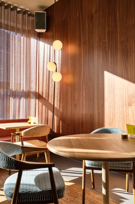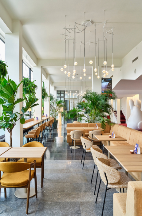 Stadscafé Boove & Benee in Schouwburg Concertzaal Tilburg heeft onlangs een renovatie ondergaan. Het theatergebouw is een rijksmonument uit 1961. Designer Nicole van Beers liet zich inspireren door de geschiedenis van het pand en creëerde een mix van historische en moderne elementen.