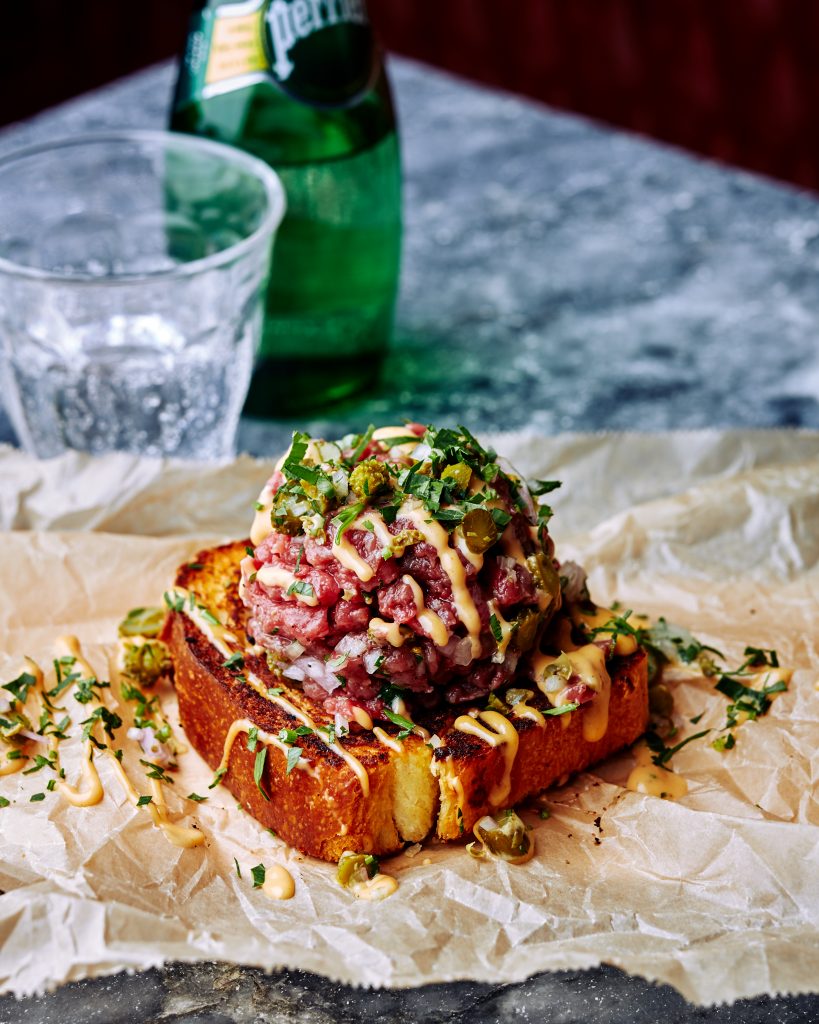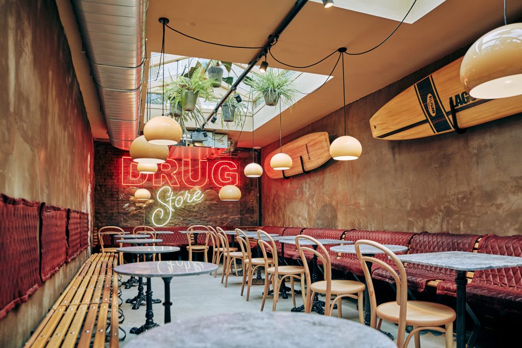 Opnieuw een vergelijkbare signatuur voor deze Libertine: geen gedekte tafels, donkere muren, veel marmer en geen mogelijkheid om te reserveren. Inspiratie voor deze nieuwe locatie komt dit keer van de ‘vintage surf collectibles’ van Surfing Cowboys aan de Amerikaanse East Coast. Naast Casper Reinders en Steven Pooters is Angelos Charisteas als derde partner aangetrokken, om eventuele groei en het uitrollen van het concept mogelijk te maken. De keukenbrigade staat net als bij Libertine café café onder leiding van Fransman Stephan Robert.