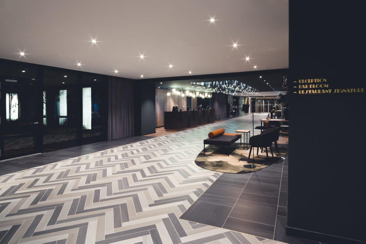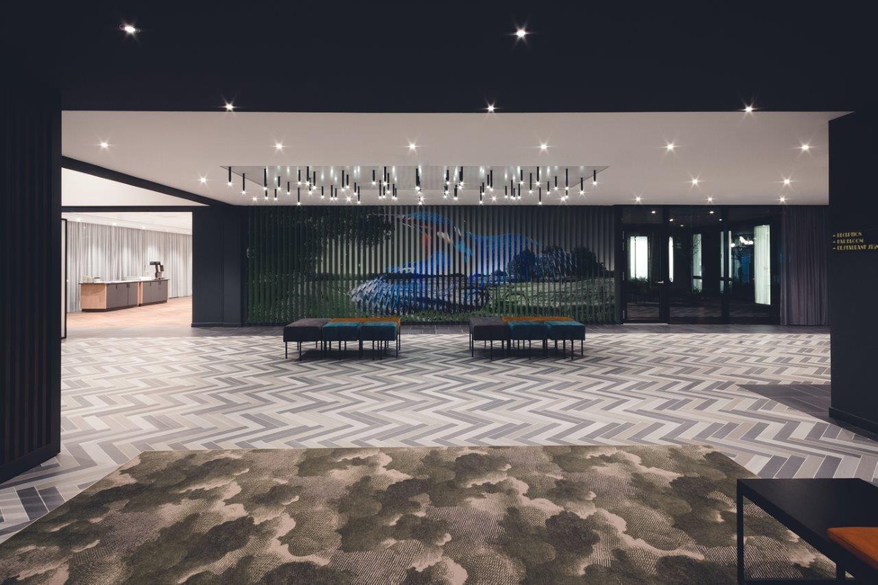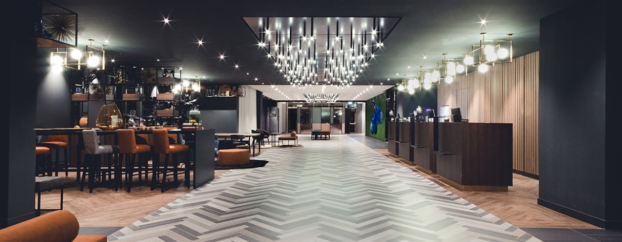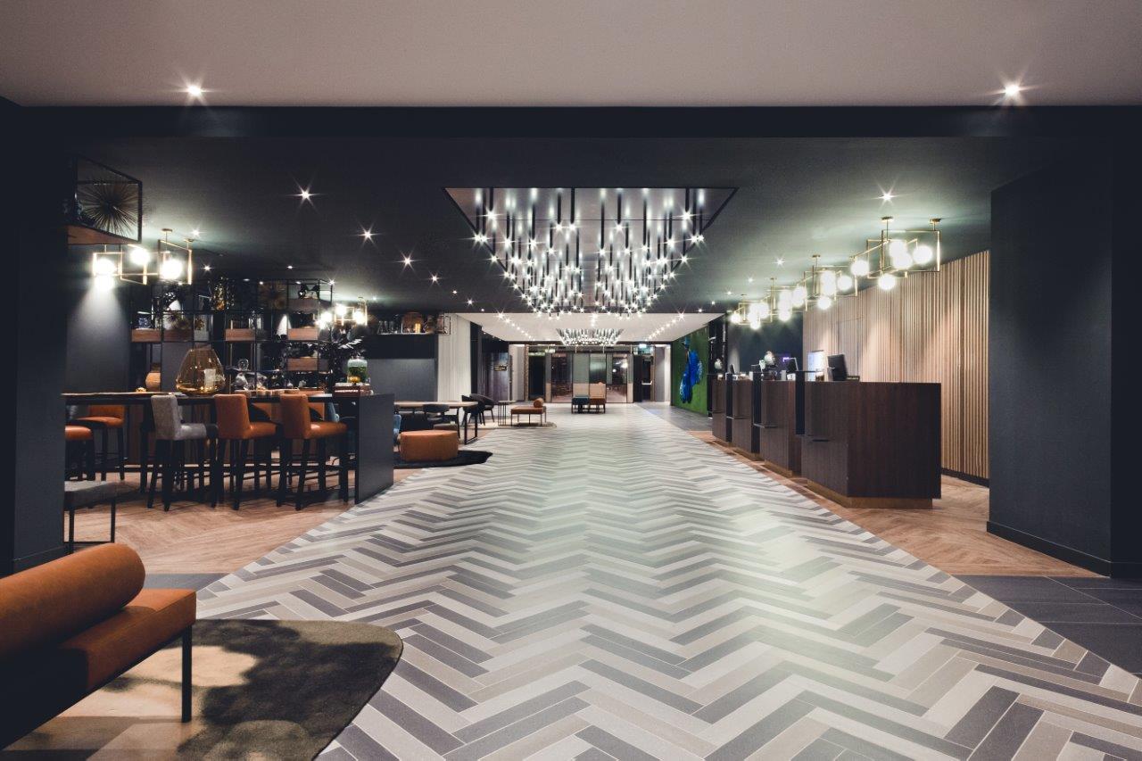 voor een dubbelhoog plafond bij de entree van het hotel. De openbare ruimten zijn zowel visueel als fysiek met elkaar verbonden door een ‘straat’, die dankzij een verlaagd plafond een warm en intiem gevoel brengt. In deze straat zijn het restaurant, de bar, de receptie, de vergaderfaciliteiten en de liften naar de kamerverdiepingen te vinden.