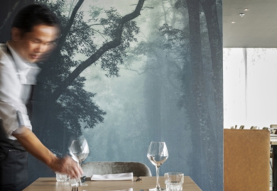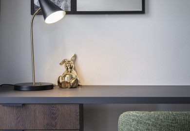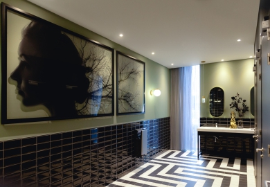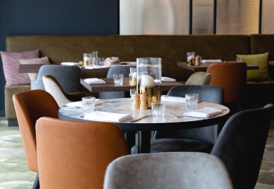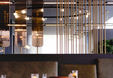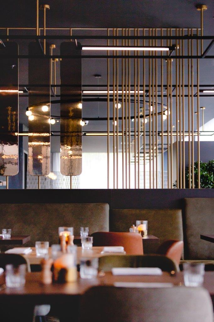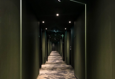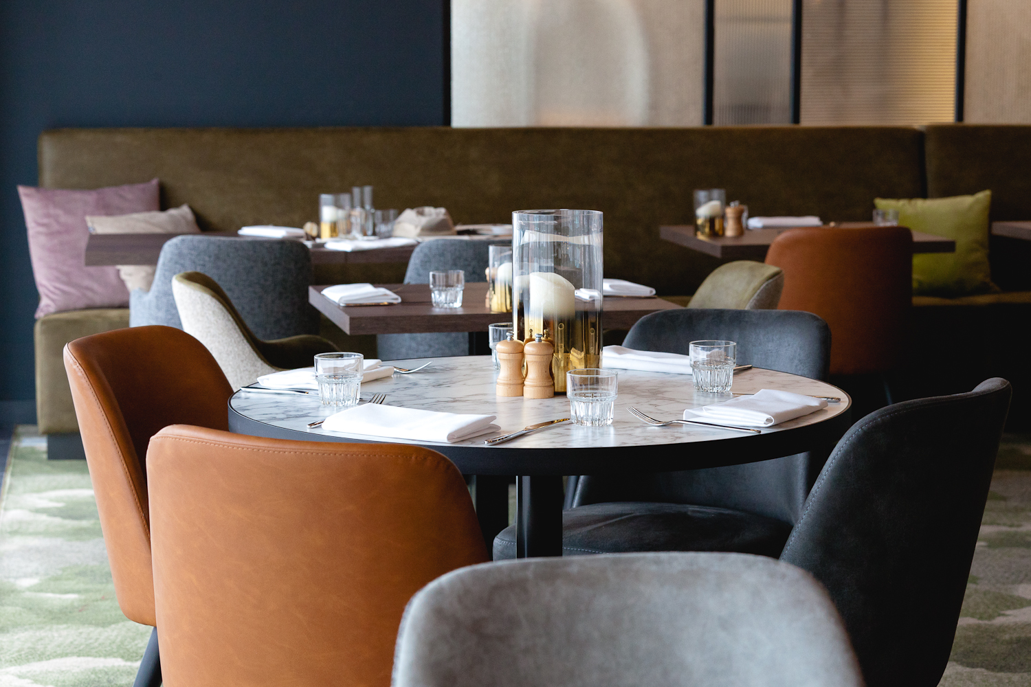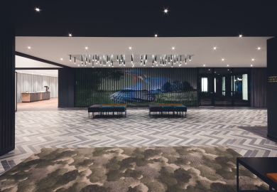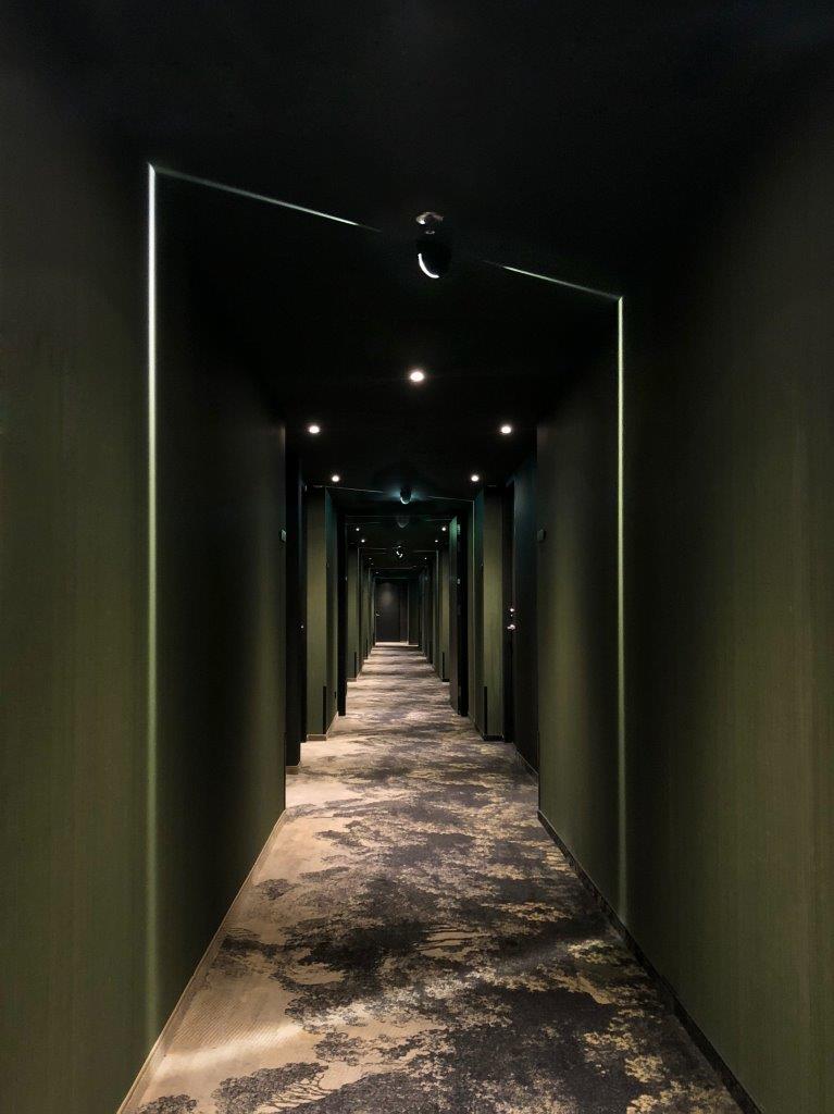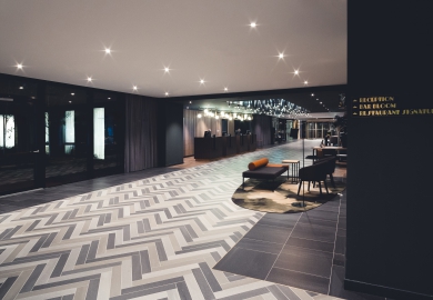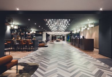 voor een dubbelhoog plafond bij de entree van het hotel. De openbare ruimten zijn zowel visueel als fysiek met elkaar verbonden door een ‘straat’, die dankzij een verlaagd plafond een warm en intiem gevoel brengt. In deze straat zijn het restaurant, de bar, de receptie, de vergaderfaciliteiten en de liften naar de kamerverdiepingen te vinden.