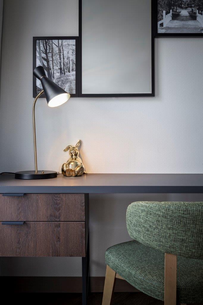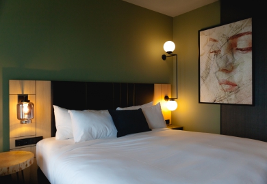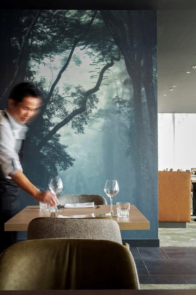 Vanaf het moment dat gasten het hotel binnenkomen, worden zij omarmd door het serene, ontspannen gevoel van een wandeling door het bos. Het interieur kent een donkergroen kleurenpallet gecombineerd met veelvuldig houtgebruik en messing accenten, met een kalme en uitnodigende sfeer als resultaat. De mix van de drie thema’s zorgt voor gelaagdheid die het interieurontwerp verrijkt. Bovendien is het unieke ontwerp een weerspiegeling van de geschiedenis én het heden van de omgeving, wat resulteert in een krachtige ‘sense of place’. De drie thema’s komen tot leven in meubels, afwerkingen, artwork en verlichting. Opvallende lijnpatronen en fascinerende, grafische elementen zijn gebruikt in behang, headboards en kunst. De signage, geïnspireerd op jaren ’30 typografie, leidt de gasten naar de gewenste bestemming. Intrigerende lichtstralen bootsen het mysterieuze lichtspel in een donker bos na. De kamers bieden de gasten veel daglicht en een rustgevend uitzicht op het Amsterdamse Bos. Ze zijn eigentijds en luxueus ingericht en geven de gasten het gevoel in een ‘home away from home’ te verblijven.