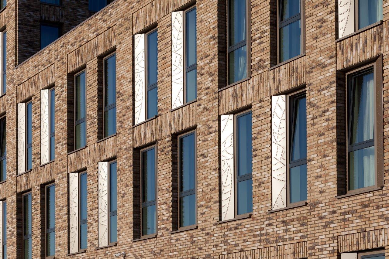 Het gebouw bestaat uit een compositie van opbouwende volumes die een centrale binnenplaats omsluit. De gevel van het hotel is bekleed met een lichte, bonte baksteen met veel reliëf en verspringende metselwerkverbanden. De ramen van de hotelkamers zijn geaccentueerd door messing zijpanelen, verfraaid met een abstract patroon van bladeren. Dit patroon verwijst op subtiele wijze naar het naastgelegen Amsterdamse Bos. Om direct bij binnenkomst een open en gastvrije sfeer te creëren, heeft Mulderblauw gekozen