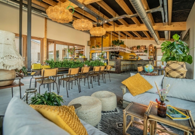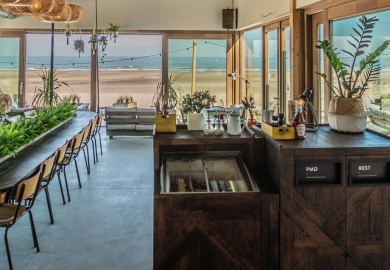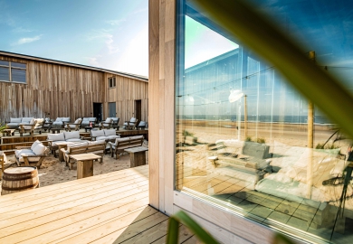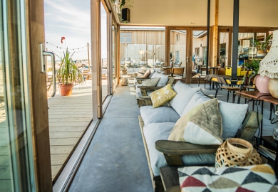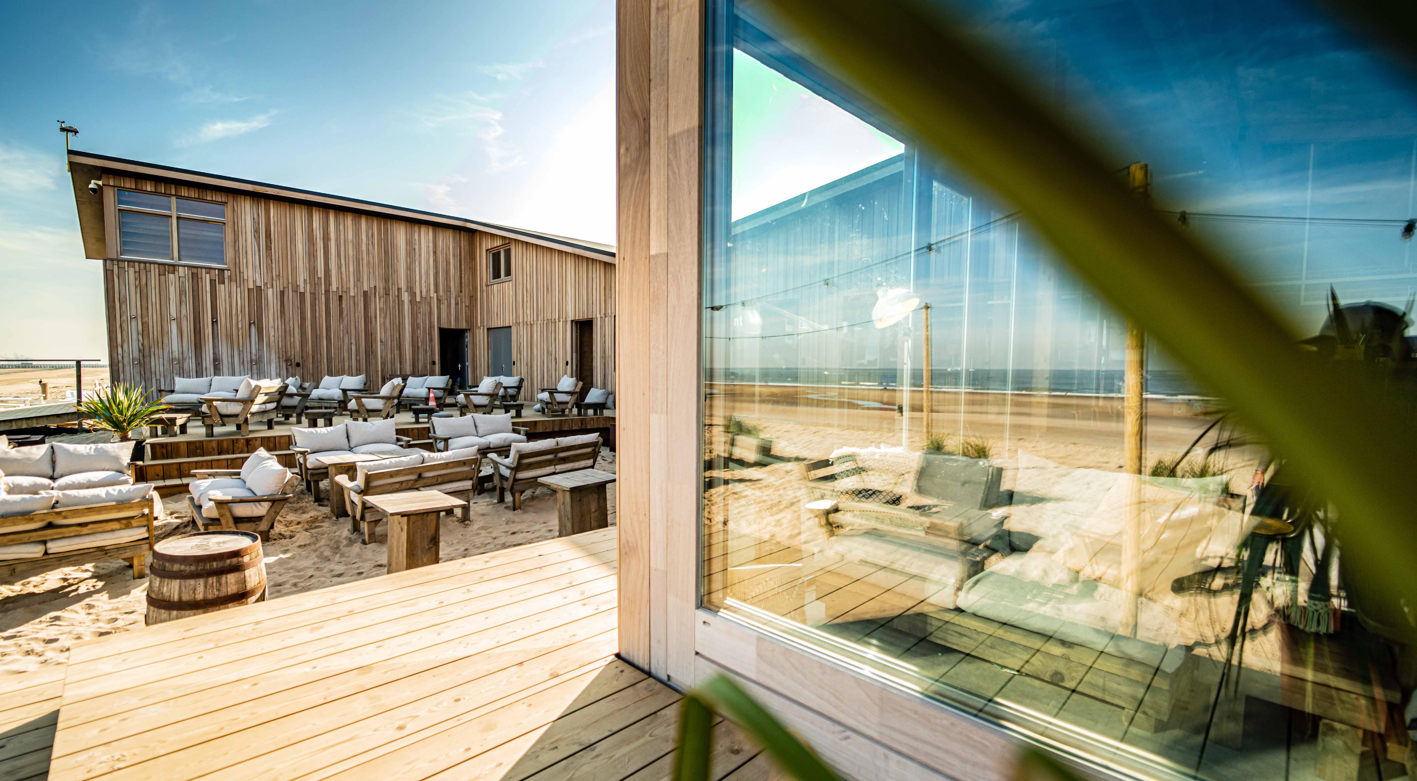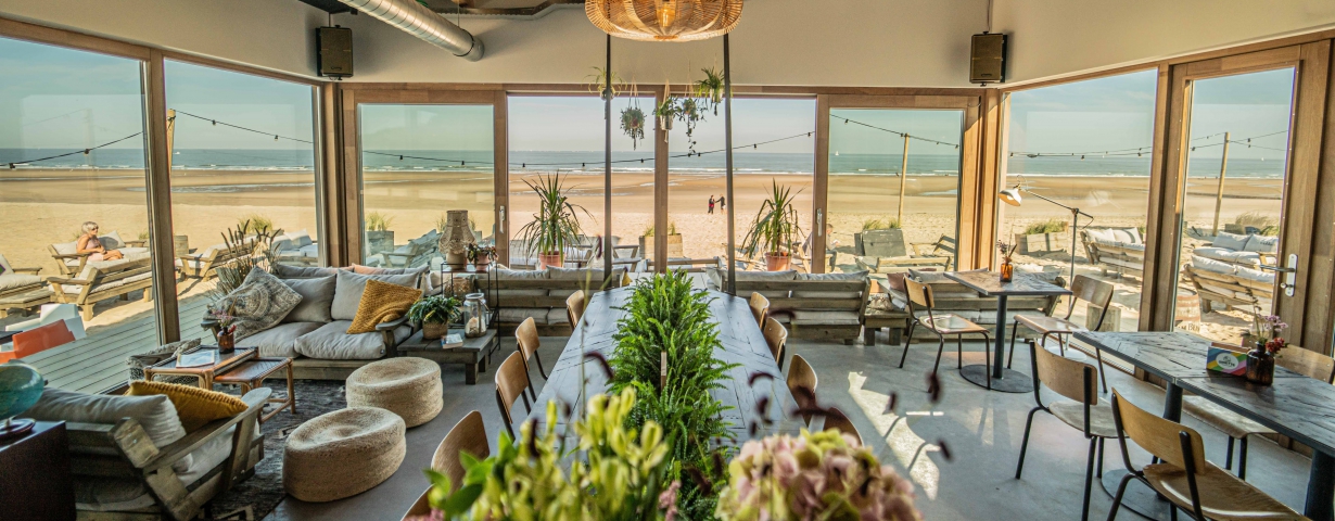 Het ontwerp met zijn natuurlijke uitstraling, zowel in materiaalgebruik als vormentaal, integreert zich perfect in het landschap zonder zich op te dringen naar de bezoekers op het strand. Het waaierende dak geeft een knipoog naar de golvende zee en de natuurlijke glooiingen in het duinenlandschap.Er werd bijzondere aandacht besteed aan de inrichting van de bar en strand terras. Een thuis-vakantie gevoel was het uitgangspunt. Een geslaagde mix van industrial, vintage en urban jungle stijlelementen creëren een perfecte dosis ongedwongenheid. De 4m zwevende tafel bv geeft een speelse toets en bovendien de flexibiliteit om tijdens grote events plaats te maken door deze giga-schommel via een ingenieus katrollen systeem de lucht in te hijsen. De transparante zitruimte met 270° zicht, geeft je het gevoel dat je je niet dichter bij strand, water en sportieve activiteiten kunt begeven.