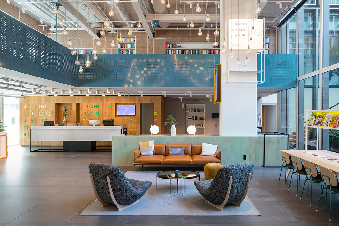 Het verhaal van Casa begint met vier studenten en een missie. Casa werd eind jaren ’50 opgericht met als doel de woningnood onder studenten op te lossen. Door de kamers gedeeltelijk beschikbaar te stellen aan hotelgasten, kan Casa tot op de dag van vandaag studenten voorzien van betaalbare huisvesting. Dit zorgt voor een unieke en inspirerende mix van mensen. Het interieur is een eclectische mix van stijlen, texturen en vormen die teruggrijpt naar Casa's studentenwortels: beschouw de nieuwe gemeenschappelijke ruimte als een grote studentenlounge die kan dienen als een plek om te ontspannen, werken, studeren of eten, afhankelijk van het type bezoeker, hun stemming of tijdstip van de dag. De bar is een centraal en belangrijk element in het ontwerp. Het verbindt de verschillende gebieden en functies. Het is het hart van ruimte waar koffie wordt geserveerd aan de receptiezijde, terwijl het functioneert als een hotelbar aan de zijkant van het restaurant.