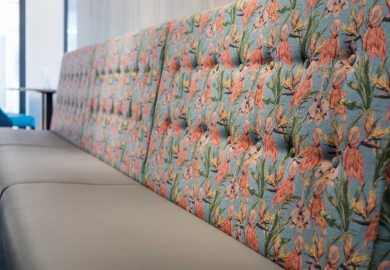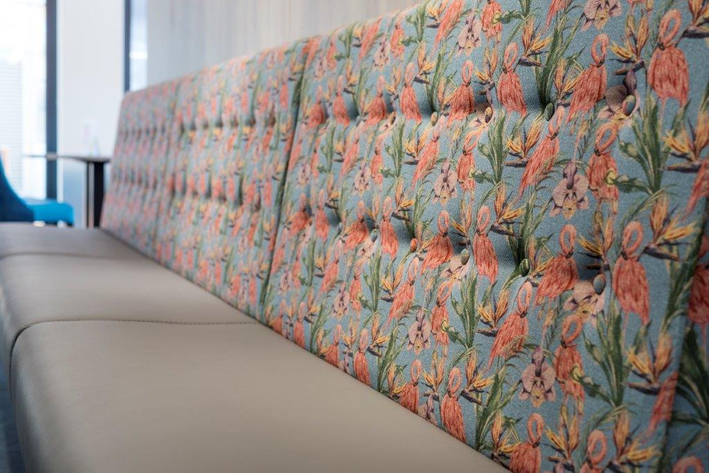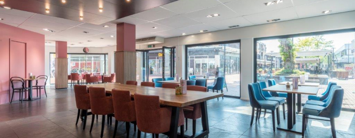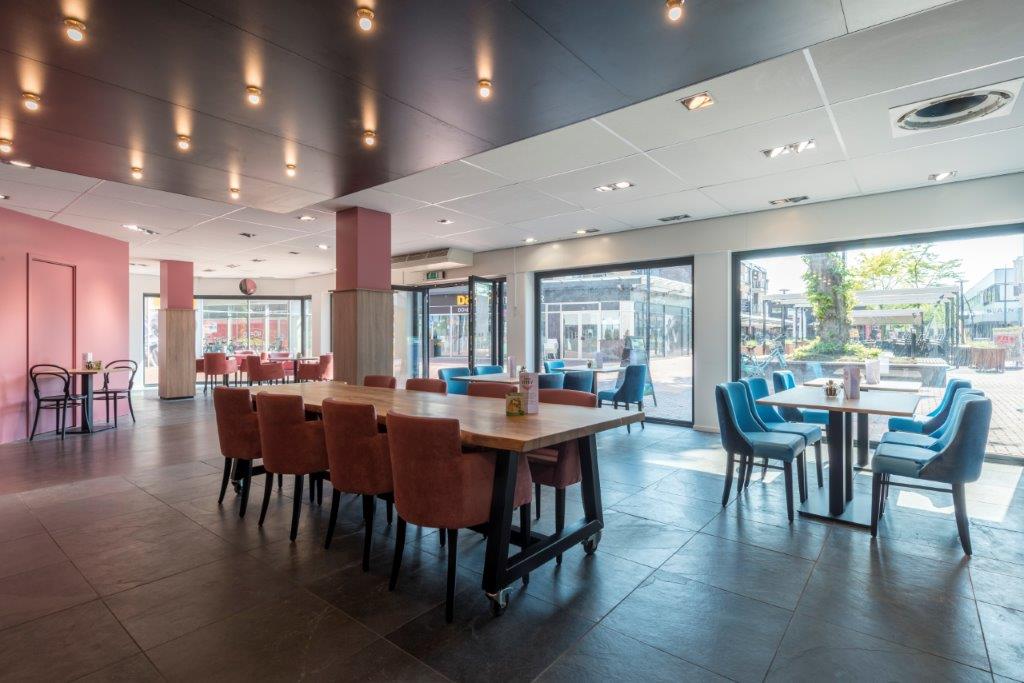 De basiskleuren zijn roze, messing en blauw. Die laatste kleur springt vooral in het oog door de lange, blauwe wand die van voor tot achter door het (voormalige winkel)pand loopt. “Die heeft één kleur, maar op verschillende plaatsen steeds een ander patroon, zoals een visgraat of diagonale ruit.” Omdat de doelgroep van de zaak heel breed is, heeft Hooijsma voor de meubelen kunstleder en stof afgewisseld. “Kunstleder op de zittingen gaat makkelijk schoon, maar stof oogt warm en vriendelijk en is goed voor de akoestiek.” Zeker de bank, met een rugleuning van stof met flamingoprint, valt op.