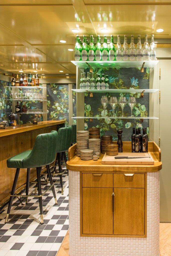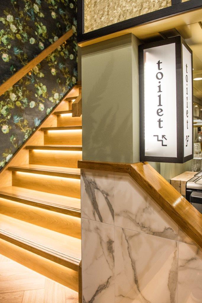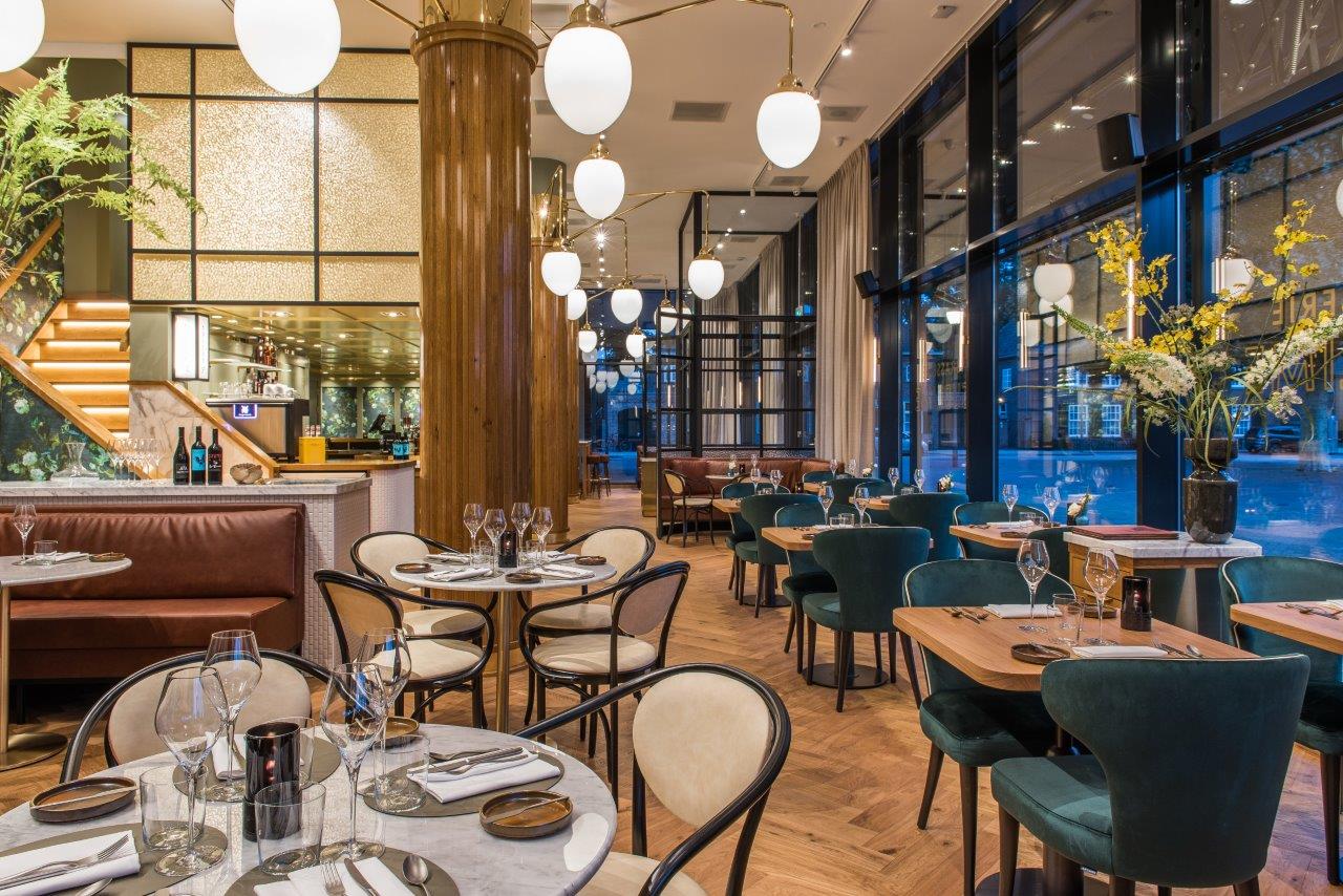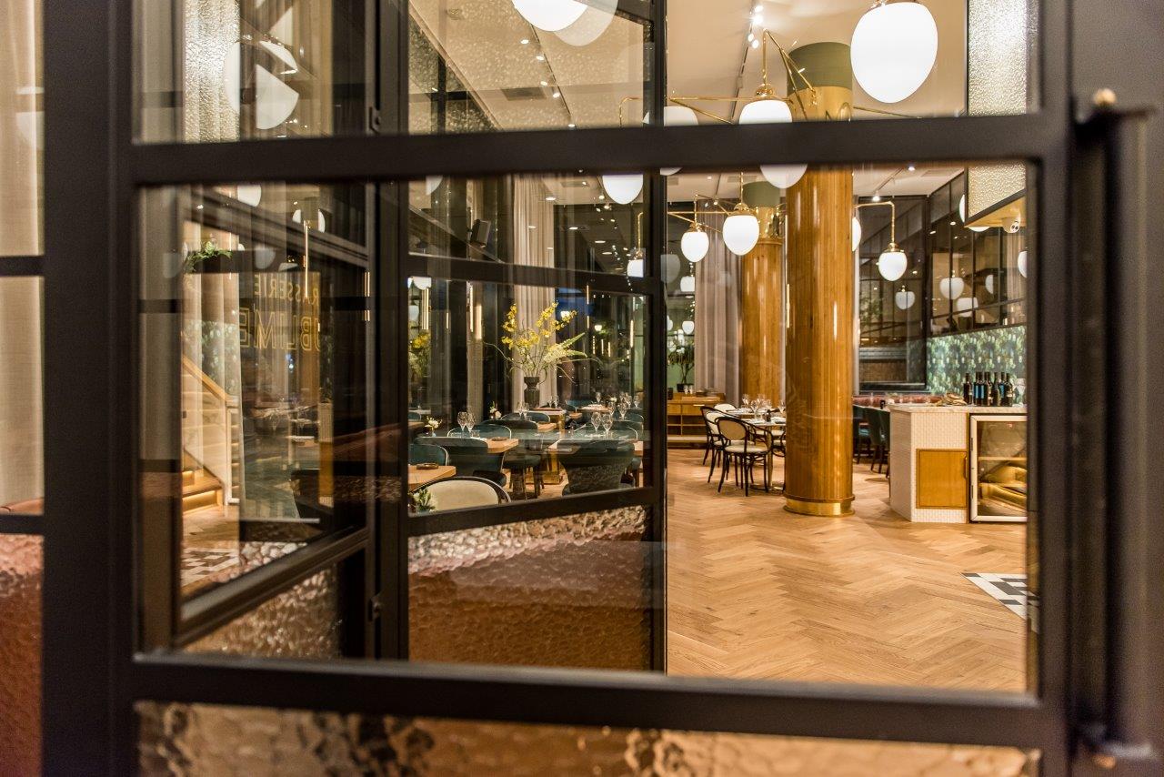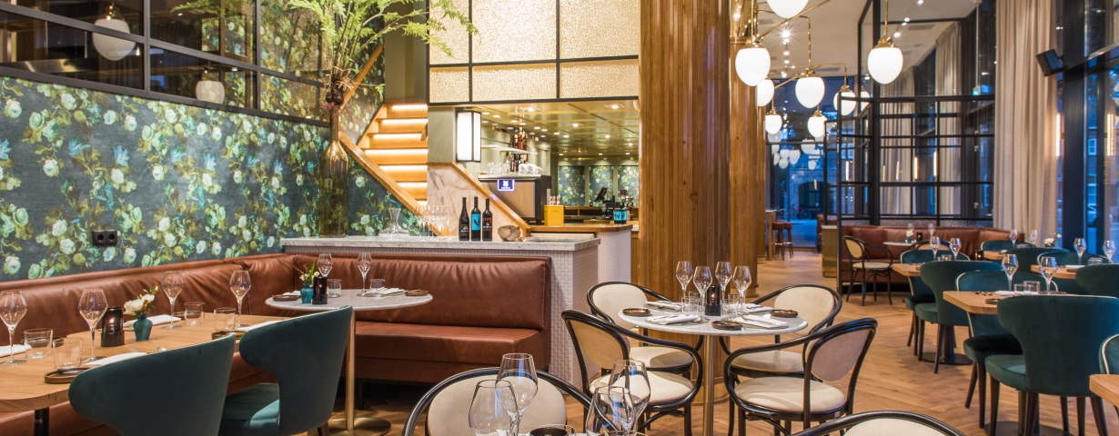 De sfeer in het restaurant doet aan Frankrijk denken, een jaren dertig-stijl met veel groen, messing en wit marmer. Eyecatchers zijn de enorme custom made verlichtingsarmaturen die bevestigd zijn aan de constructieve kolommen. Ze benadrukken de hoogte van het pand en dienen als echte sfeermakers. “Het is een concept dat er in Waalwijk nog niet is", zegt Roksnoer.