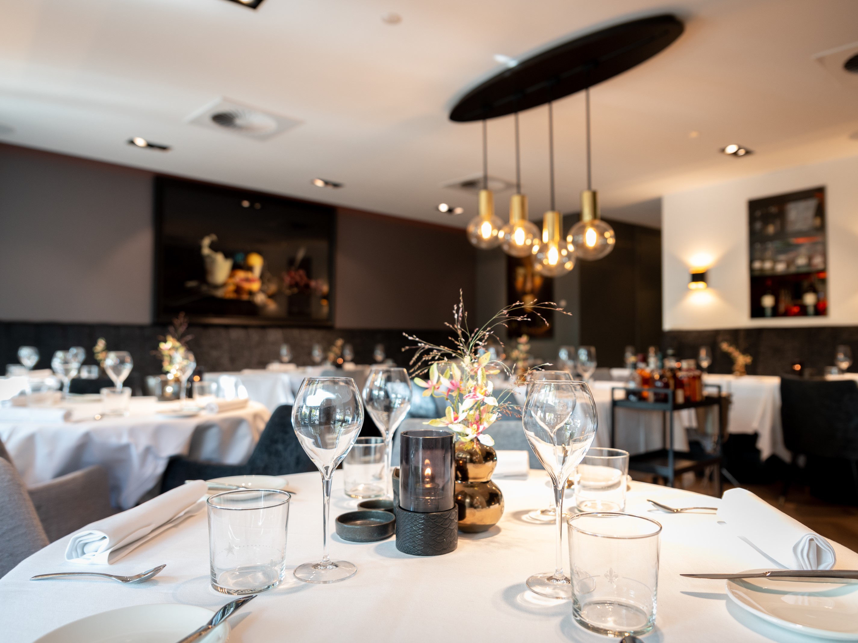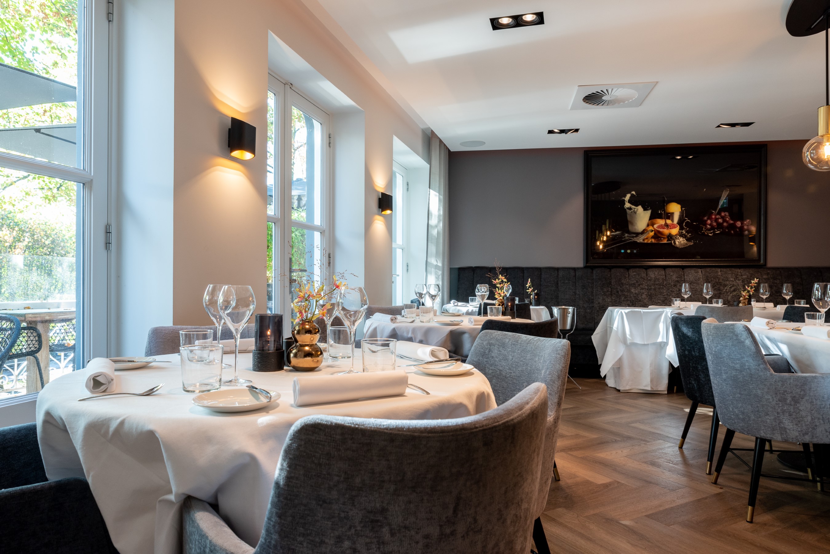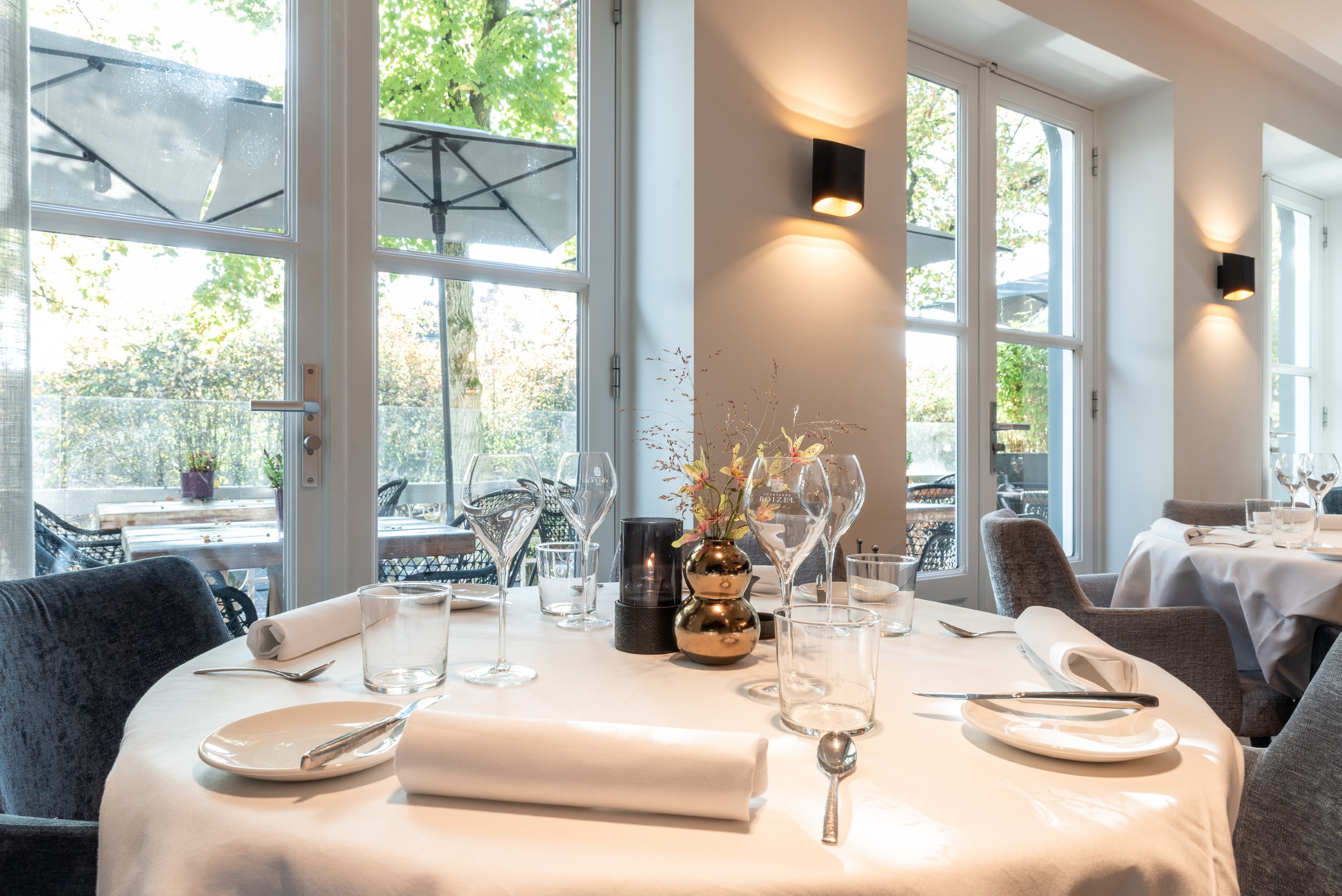 Bij het hedendaagse interieur is gebruikgemaakt van rustige kleuren en een visgraatvloer. De met stof beklede stoelen en tafels zijn ingedekt met linnen en glanzend bestek.