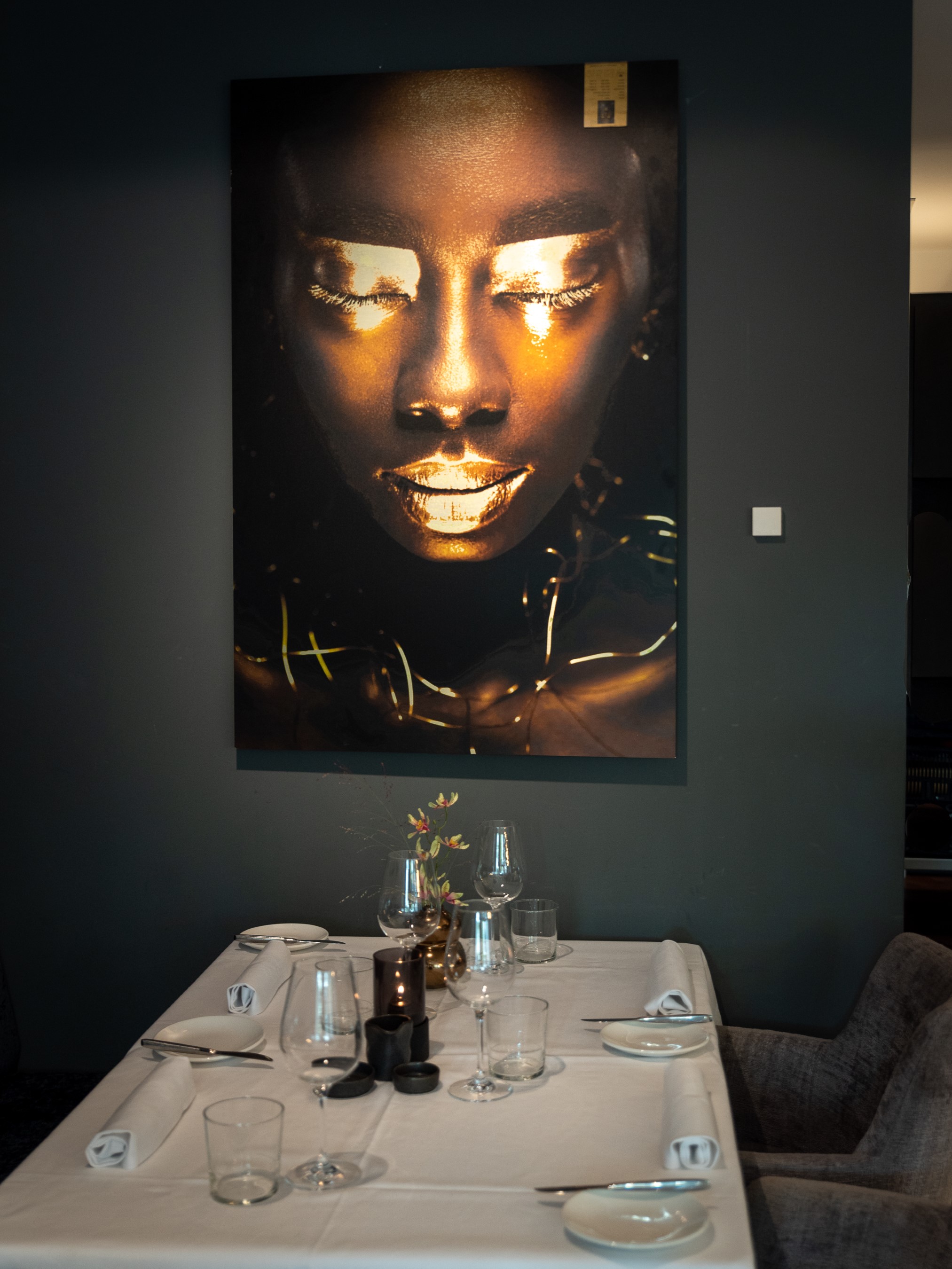 Eyecatchers zijn de kunst aan de muren en de grote lamp met glazen bollen. Een extra attractie is de naast de gedeeltelijk open keuken gelegen wijnkamer die tevens dienst doet als chef’s table. De klassieke lambrisering in deze ruimte is een verwijzing naar de voormalige Balkonkamer van De Swaen. Bij warm weer kan er buiten gegeten worden op het terras van het balkon, dat uitzicht biedt over De Lind.