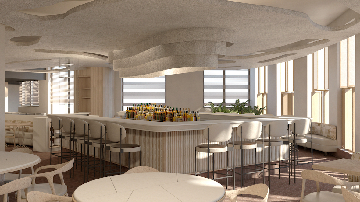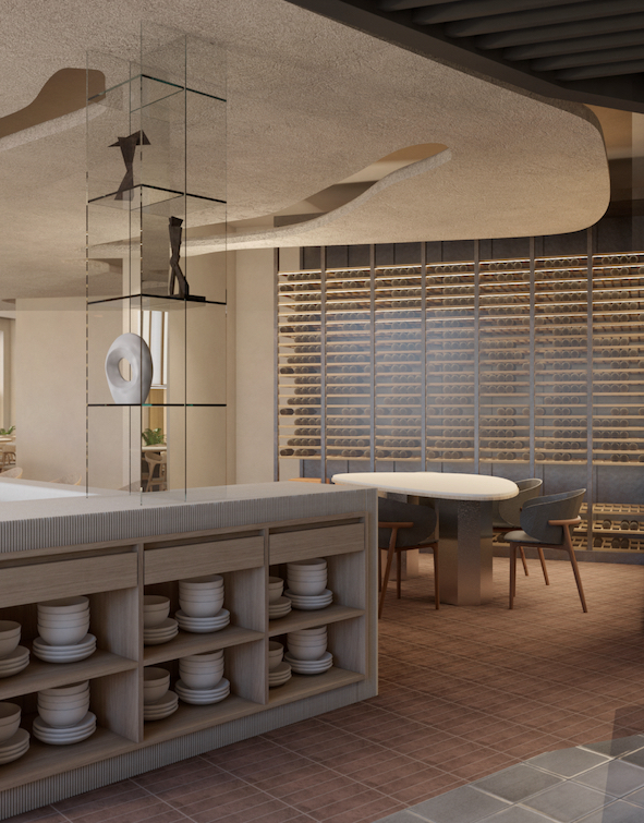 Van de 26e etage dalen we weer naar beneden, naar de tweede etage. Daar openden Ori Geller en Hari Shetty recentelijk restaurant Nela, waar chefs doen aan ‘live fire cooking’. En ook Nela is met recht een designparel te noemen. Geller: “The Valley is een van de nieuwste en meest indrukwekkende herkenningspunten in Amsterdam. Het was voor ons belangrijk om de look-and-feel van het bijzondere complex door te trekken in ons restaurant.” Iedere plek in het restaurant moet volgens Geller net als in The Valley een beleving zijn. “Daarom zijn er verschillende ‘secties’ met eigen vibes gecreëerd. Van de ontvangstruimte tot de chef’s counter aan de opvallende open keuken en de dining area.” Hij vervolgt: “Het duurzame Valley-gevoel komt ook terug in het gebruik van natuurlijke materialen. Zo is de bar van natuursteen en hout en van binnen metaal. We voeren dit tevens door in de aankleding. Zo is onze keramiek op ambachtelijke wijze speciaal voor ons gemaakt door meerdere lokale keramisten.” Bijzonder is verder het plafond, dat eruit ziet als een landschap en waar kunstmatig licht doorheen schijnt. De ‘kroonluchter’ boven de bar is een mooie toevoeging. De ondernemers werkten samen met designbureau Framework van Thomas Geerlings, met Francesca Finotti als projectmanager.