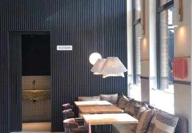 Publikk&Vos heeft het ‘dorp in de stad’ gevoel tot in de puntjes doorgevoerd in design en concept. Een formule die ook prima past op andere locaties. “Stadse elementen in beton en wittinten worden afgewisseld met versgeplukte kleuren van het platteland, zoals varkentjesroze en sperzieboongroen”, noemt Veldkamp als voorbeeld. “Het meubilair is een mengelmoes van strak, stads design en landelijke elementen. En ook op de kaart, die van ontbijt tot cocktails gaat, mixen we dorps en stads met lokale invloeden. Dus wel gewoon pannenkoeken, maar dan gevuld met pekingeend of lokale ingrediënten.” Wat Veldkamp ook belangrijk vindt: “We hebben twee uitgangen. En we hopen van harte dat bewoners en vaste gasten gewoon “achterom” komen, zoals dat in een dorp normaal is. Dat ze gaan zitten en een kop koffie pakken, alsof ze thuis zijn.”
