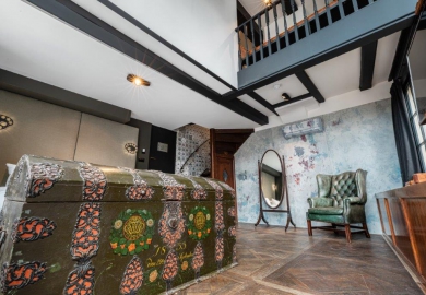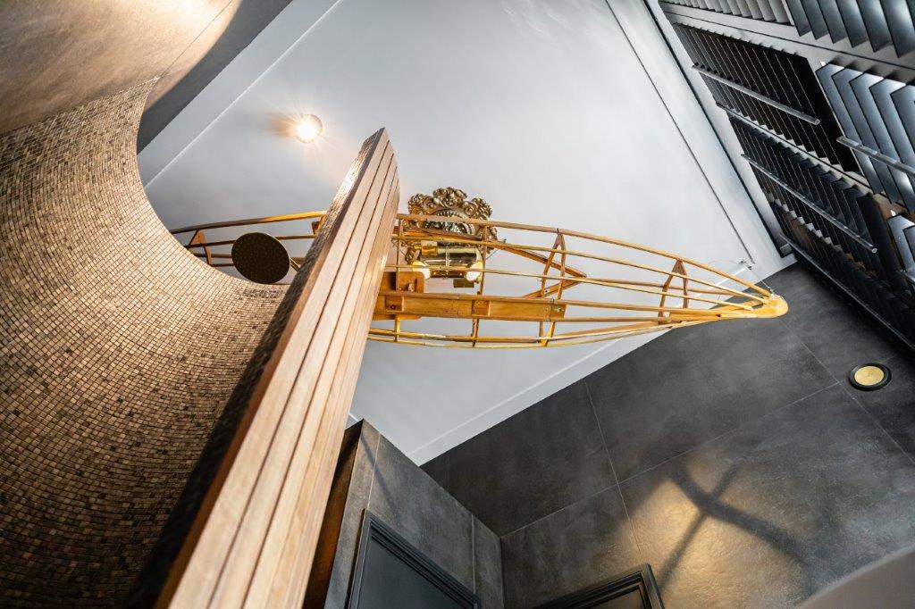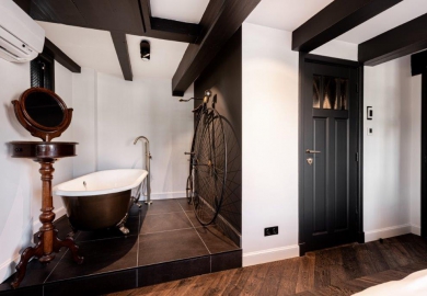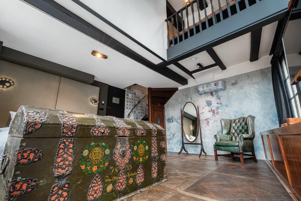 Zandbergen schakelde Stef van der Bijl in voor het interieur, die hierbij samenwerkte met onder andere Aart Taminiau en Joram Barbiers. Ze vervolgt: “Gasten omschrijven het hotel als een museum. Zo geeft een wandschildering in de gang de geschiedenis van het pand weer en vinden gasten in sommige kamers lampen bevestigd in een antieke vouwkano aan het plafond, kunstwerken gemaakt van honderden uurwerken en kledingkasten gemaakt van een vliegtuigdeur uit een Fokker F28. In de ontbijtzaal hangen bovendien twee indrukwekkende opgeknapte operatielampen.”
