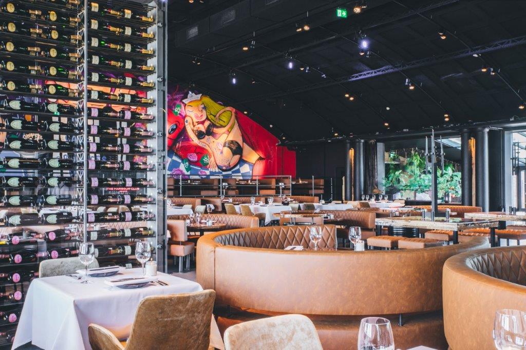 ”Eyecatchers zijn volgens de twee de enorme muurschildering van Selwyn Senatori, de ‘golden sharks’ boven de barren en de wijnklimaatkast met drieduizend flessen. Ook opvallend: de gerecyclede tafels van het hout van oude wagonbielzen.