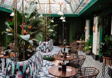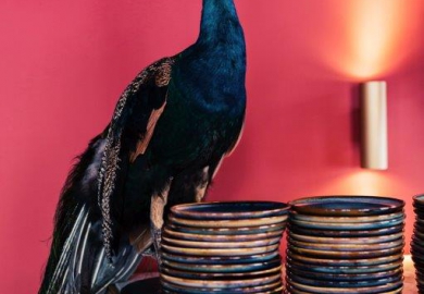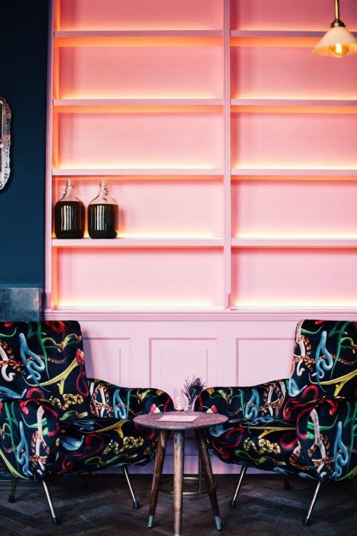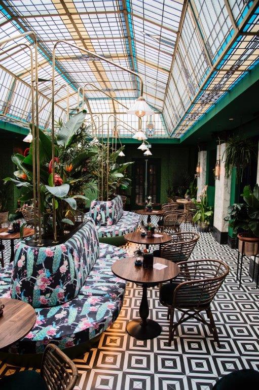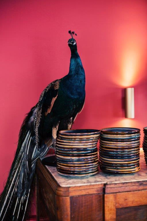 Op de kaart staan (uiteraard) streetfood, allday-brunch en cocktails. Opvallend is het extravagante interieur, gerealiseerd door Sippien Baarsma, dat uit verschillende ‘werelden’ bestaat die qua stijl op elkaar aansluiten. Zo is er een roze ruimte, met als eyecatcher een zelfontworpen tapijt. Daarnaast is een voormalige binnentuin omgetoverd tot tuinkamer. “Het glas-in-lood hier is gerestaureerd en gereinigd, en zorgt nu voor een prachtige lichtinval. Ook is deze ruimte botanisch en op andere manieren groen ingericht.” Tussen alle ruimtes zitten diverse doorgangen die eveneens mooie doorkijkjes bieden. Verder komt overal in het interieur de pauw subtiel terug: van de gordijnen en het behang tot een opgezette versie. Genoeg elementen dus om de ogen uit te kijken. In samenwerking met Baarsma realiseerde DEP het ontwerp en de installatie van de algemene en sierverlichting, alsook de installatie van het geluid.