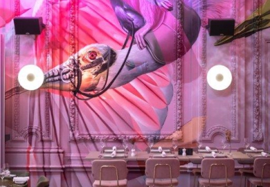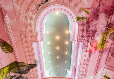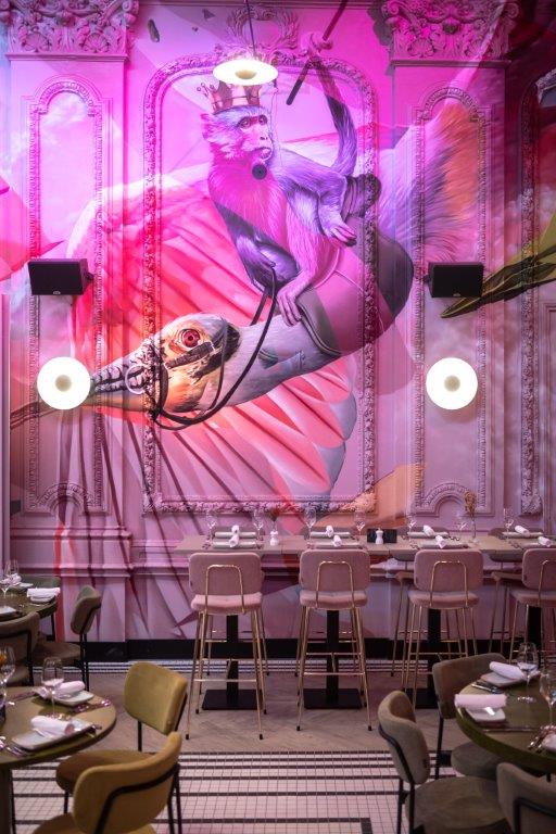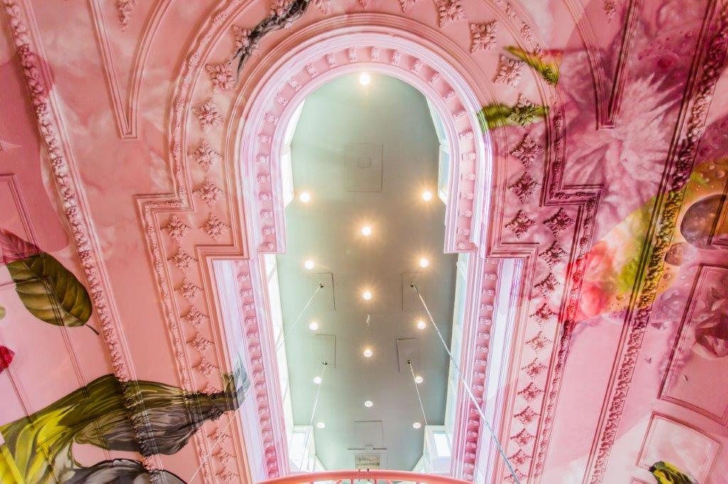 De eigenaar, Paul van Boxtel, wilde iets compleet anders met het klassieke pand, dat al sinds 1881 lichtbeige muren met barokke lijsten had. “Die wanden wilden we intact laten, maar het mocht sprekender, moderner en het liefst in één steunkleur”, vertelt Van Boxtel. Ontwerpers Marco van de Brand en Studio Giftig besloten dat dat roze moest worden: warm, modern en apart. Studio Giftig kreeg bovendien de vrije opdracht om allesomvattende wandschilderingen te maken, die dwars door de barokke lijsten en ornamenten zouden lopen.