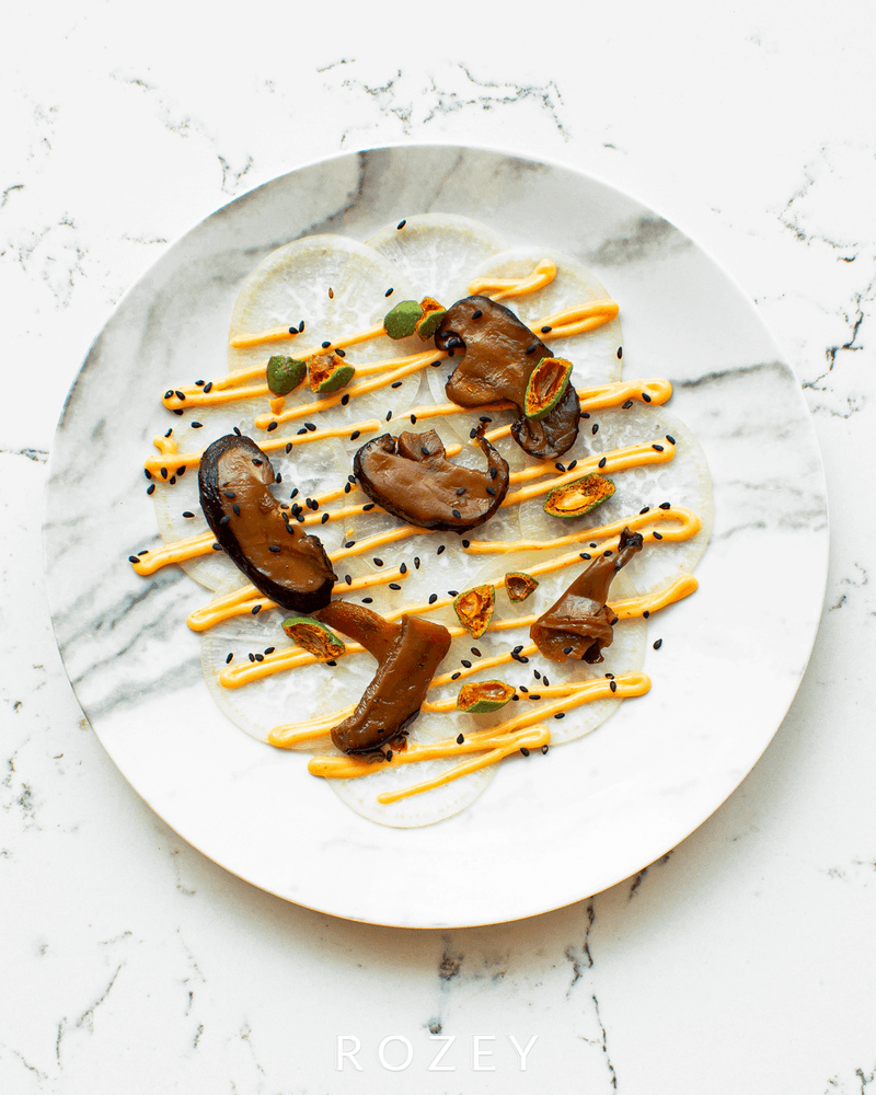 De inrichting van het restaurant in Delft is wat klassieker dan de stoere en robuuste vestiging in Rotterdam, maar het menu is hetzelfde. Ook bij Rozey in Delft is ongeveer de helft van de kaart vegetarisch en de andere helft vegan.