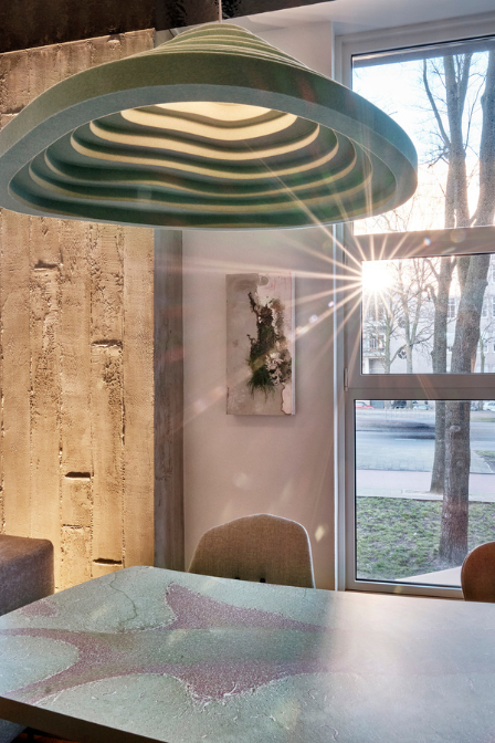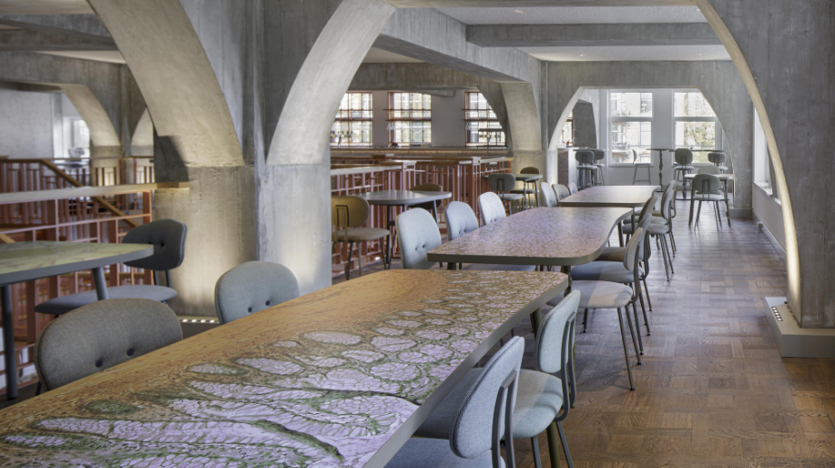 Het thema van het innerlijke zelf is ook doorgevoerd in de meubels. Spruyt vertelt: “Vanaf het moment dat je een menu leest, worden neuronen in je hersenen geactiveerd. Dit wilde ik vormgeven in de tafelbladen. En terwijl je eet, zijn je speekselklieren actief, dus die schoonheid wilde ik ook op een paar tafels uitbeelden.” Het resultaat is tafelbladen met sterk uitvergrote afbeeldingen van menselijke organen op cellulair niveau.